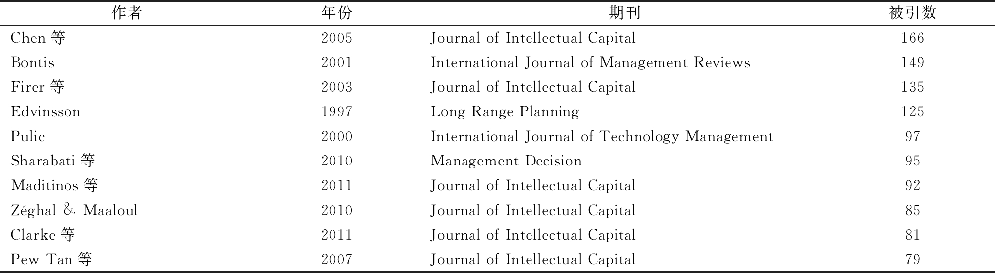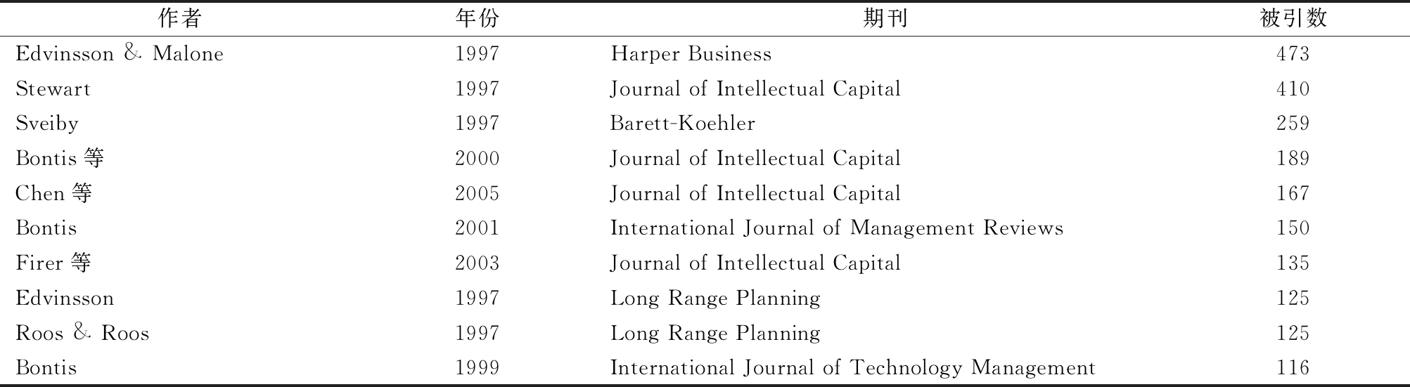 作者年份期刊被引数Edvinsson & Malone1997Harper Business473Stewart1997Journal of Intellectual Capital410Sveiby1997Barett-Koehler259Bontis等2000Journal of Intellectual Capital189Chen等2005Journal of Intellectual Capital167Bontis2001International Journal of Management Reviews150Firer等2003Journal of Intellectual Capital135Edvinsson1997Long Range Planning125Roos & Roos1997Long Range Planning125Bontis1999International Journal of Technology Management116