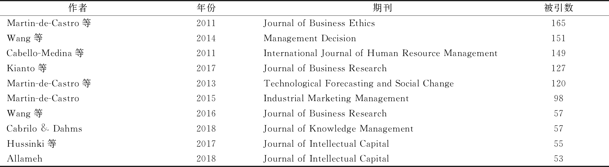 作者年份期刊被引数Martin-de-Castro等2011Journal of Business Ethics165Wang等2014Management Decision151Cabello-Medina等2011International Journal of Human Resource Management149Kianto等2017Journal of Business Research127Martin-de-Castro等2013Technological Forecasting and Social Change120Martin-de-Castro2015Industrial Marketing Management98Wang等2016Journal of Business Research57Cabrilo & Dahms2018Journal of Knowledge Management57Hussinki等2017Journal of Intellectual Capital55Allameh2018Journal of Intellectual Capital53