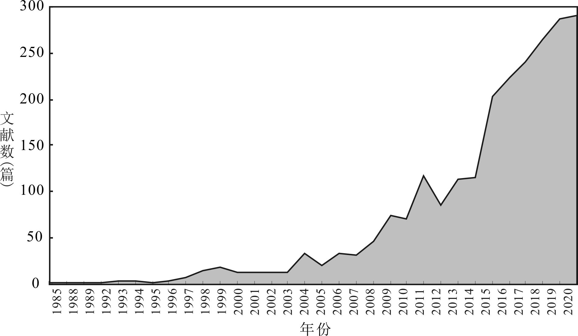 2 356篇样本文献分布于911种不同期刊,涉及916位作者,作者合作指数为2.39。图2展示了样本文献的时间分布,样本文献中知识资本一词最早出现在1985年,此后,文献总量呈不断增长趋势。从2011年开始,关于IC研究的文献年新增量突破100篇,2014年呈快速增长趋势,2015年文献量比2014年翻一番,2020年达到峰值290篇。样本文献中超过一半发表于近5年(64.01%),说明近年来学界对IC领域的关注度显著提高。