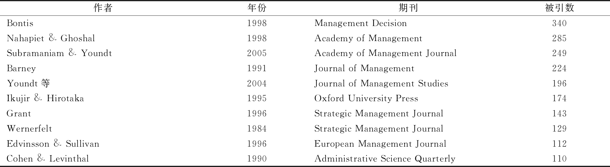 作者年份期刊被引数Bontis1998Management Decision340Nahapiet & Ghoshal1998Academy of Management285Subramaniam & Youndt2005Academy of Management Journal249Barney1991Journal of Management224Youndt等2004Journal of Management Studies196Ikujir & Hirotaka1995Oxford University Press174Grant1996Strategic Management Journal143Wernerfelt1984Strategic Management Journal129Edvinsson & Sullivan1996European Management Journal112Cohen & Levinthal1990Administrative Science Quarterly110