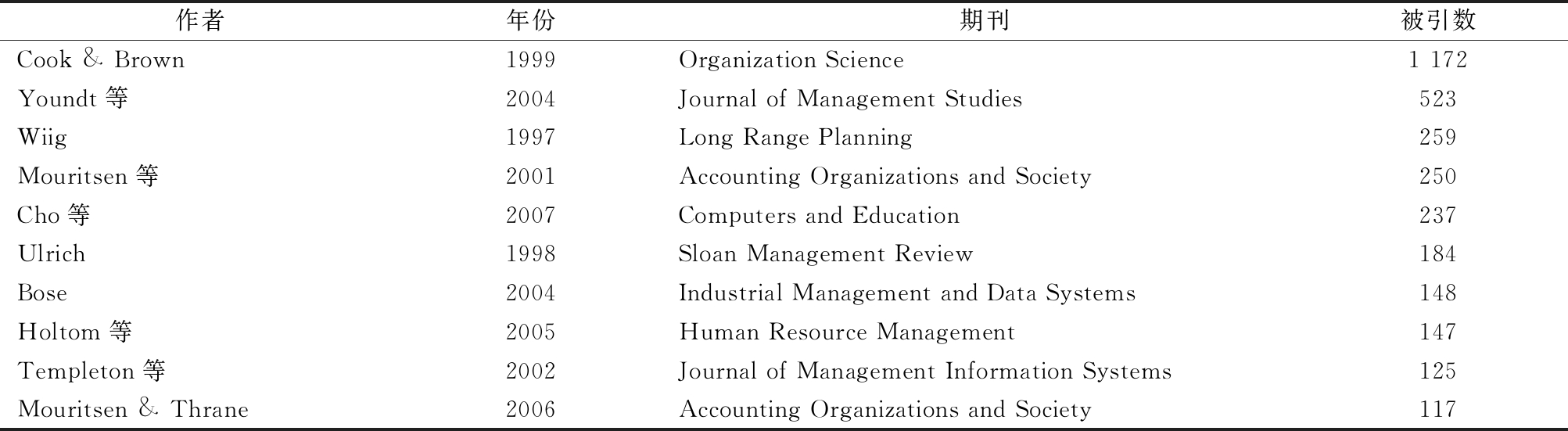 作者年份期刊被引数Cook & Brown1999Organization Science1 172Youndt等2004Journal of Management Studies523Wiig1997Long Range Planning259Mouritsen等2001Accounting Organizations and Society250Cho等2007Computers and Education237Ulrich1998Sloan Management Review184Bose2004Industrial Management and Data Systems148Holtom等2005Human Resource Management147Templeton等2002Journal of Management Information Systems125Mouritsen & Thrane2006Accounting Organizations and Society117