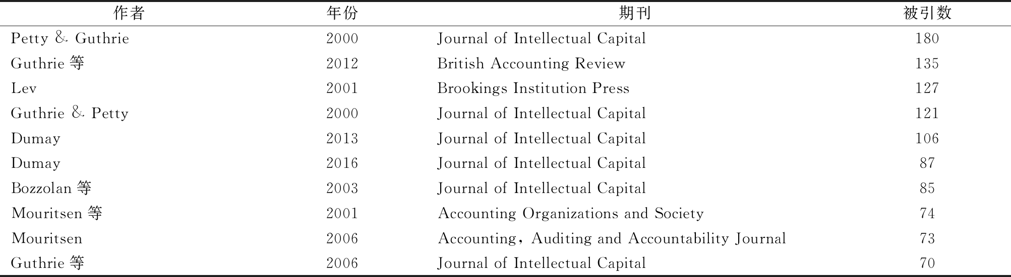作者年份期刊被引数Petty & Guthrie2000Journal of Intellectual Capital180Guthrie等2012British Accounting Review135Lev2001Brookings Institution Press127Guthrie & Petty2000Journal of Intellectual Capital121Dumay2013Journal of Intellectual Capital106Dumay2016Journal of Intellectual Capital87Bozzolan等2003Journal of Intellectual Capital85Mouritsen等2001Accounting Organizations and Society74Mouritsen2006Accounting, Auditing and Accountability Journal73Guthrie等2006Journal of Intellectual Capital70