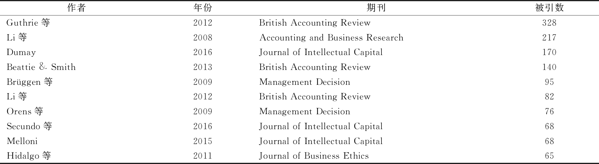 作者年份期刊被引数Guthrie等2012British Accounting Review328Li等2008Accounting and Business Research217Dumay2016Journal of Intellectual Capital170Beattie & Smith2013British Accounting Review140Brüggen等2009Management Decision95Li等2012British Accounting Review82Orens等2009Management Decision76Secundo等2016Journal of Intellectual Capital68Melloni2015Journal of Intellectual Capital68Hidalgo等2011Journal of Business Ethics65