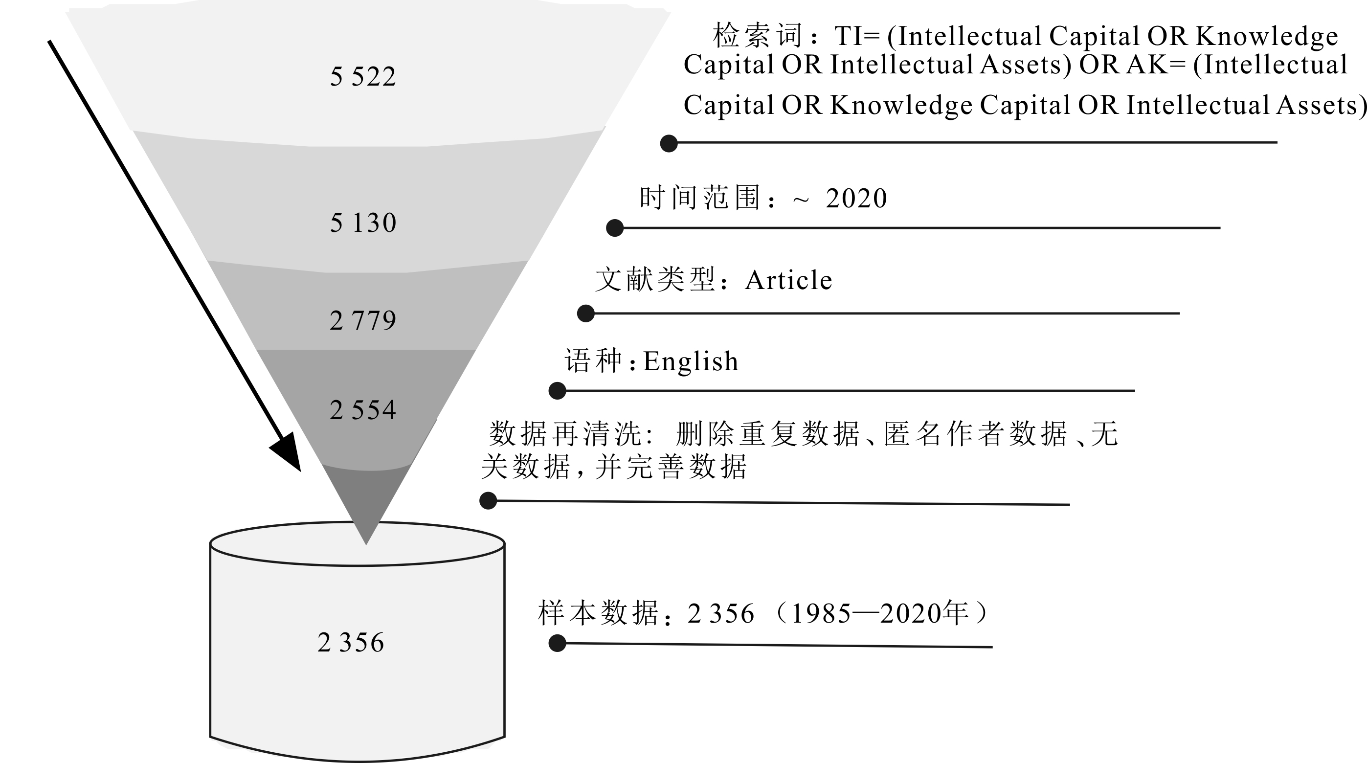 本文文献数据来源于WoS核心合集数据库,遵循既有文献综述中使用的方法,对数据进行进一步筛选,重点调查已有文献轨迹。知识资本也称为智力资本(Knowledge Capital,KP)或知识资产(Intellectual Assets,IAs),本文沿用知识资本这一学界的普遍称谓,但在采集文献和引用其他作者文献时,也涵盖其它两个名称的文献。本文检索词的选取依据相关经典文献中经常使用的核心词汇(Stewart,1997;Sveiby,1997;Pulic,2000),初步采集到2 554篇文献数据,图1展示了文献检索与清洗过程。