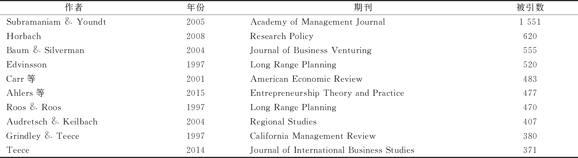 作者年份期刊被引数Subramaniam & Youndt2005Academy of Management Journal1 551Horbach2008Research Policy620Baum & Silverman2004Journal of Business Venturing555Edvinsson1997Long Range Planning520Carr等2001American Economic Review483Ahlers等2015Entrepreneurship Theory and Practice477Roos & Roos1997Long Range Planning470Audretsch & Keilbach2004Regional Studies407Grindley & Teece1997California Management Review380Teece2014Journal of International Business Studies371