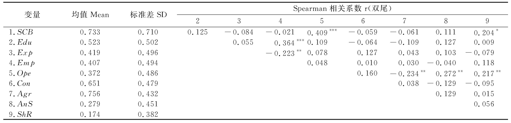 变量均值Mean标准差SDSpearman相关系数r(双尾)234567891.SCB0.7330.7100.125-0.084-0.0210.409***-0.059-0.0610.1110.204*2.Edu0.5230.5020.0550.364***0.109-0.064-0.1090.1270.0093.Exp0.4190.496-0.223**0.0780.1270.0430.103-0.0794.Emp0.4070.4940.0480.0100.030-0.0400.1185.Ope0.3720.4860.160-0.234**0.272**0.217**6.Con0.6510.4790.038-0.129-0.0957.Agr0.7560.4320.1290.0158.AnS0.2790.4510.0569.ShR0.1740.382