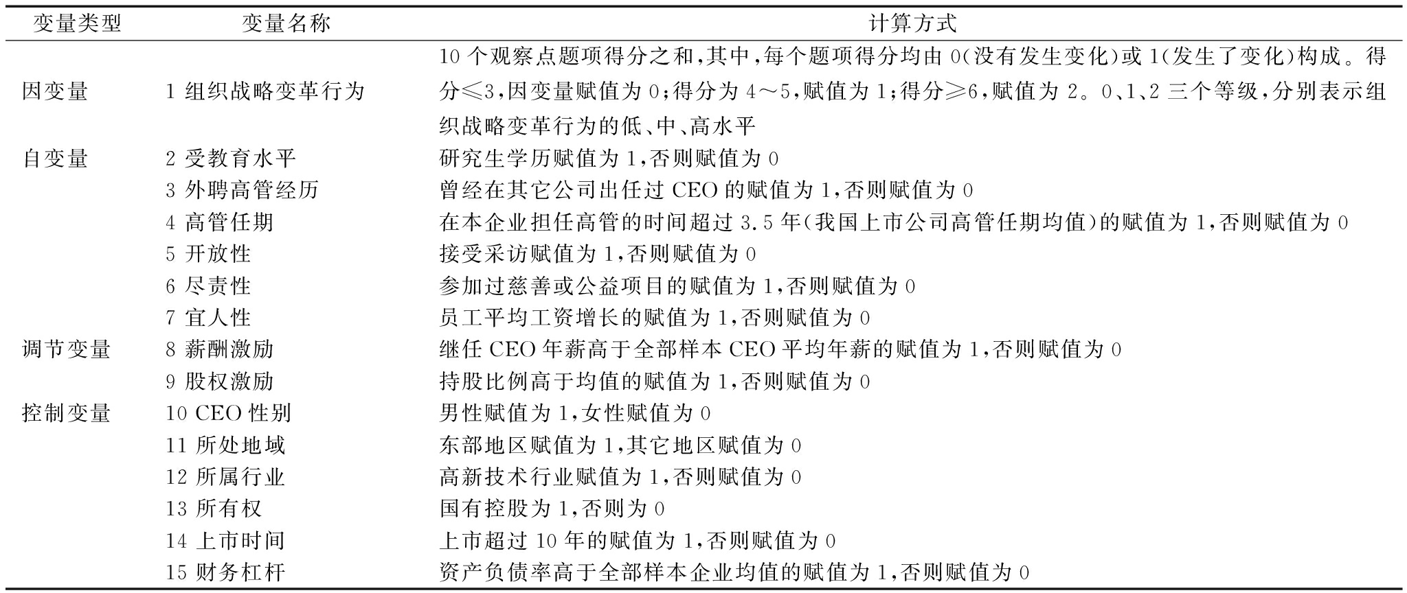 变量类型变量名称计算方式因变量1 组织战略变革行为10个观察点题项得分之和,其中,每个题项得分均由0(没有发生变化)或1(发生了变化)构成。得分≤3,因变量赋值为0;得分为4~5,赋值为1;得分≥6,赋值为2。0、1、2三个等级,分别表示组织战略变革行为的低、中、高水平自变量2 受教育水平研究生学历赋值为1,否则赋值为03 外聘高管经历曾经在其它公司出任过CEO的赋值为1,否则赋值为04 高管任期在本企业担任高管的时间超过3.5年(我国上市公司高管任期均值)的赋值为1,否则赋值为05 开放性接受采访赋值为1,否则赋值为06 尽责性参加过慈善或公益项目的赋值为1,否则赋值为07 宜人性员工平均工资增长的赋值为1,否则赋值为0调节变量8 薪酬激励继任CEO年薪高于全部样本CEO平均年薪的赋值为1,否则赋值为09 股权激励持股比例高于均值的赋值为1,否则赋值为0控制变量10 CEO性别男性赋值为1,女性赋值为011 所处地域东部地区赋值为1,其它地区赋值为012 所属行业高新技术行业赋值为1,否则赋值为013 所有权国有控股为1,否则为014 上市时间上市超过10年的赋值为1,否则赋值为015 财务杠杆资产负债率高于全部样本企业均值的赋值为1,否则赋值为0