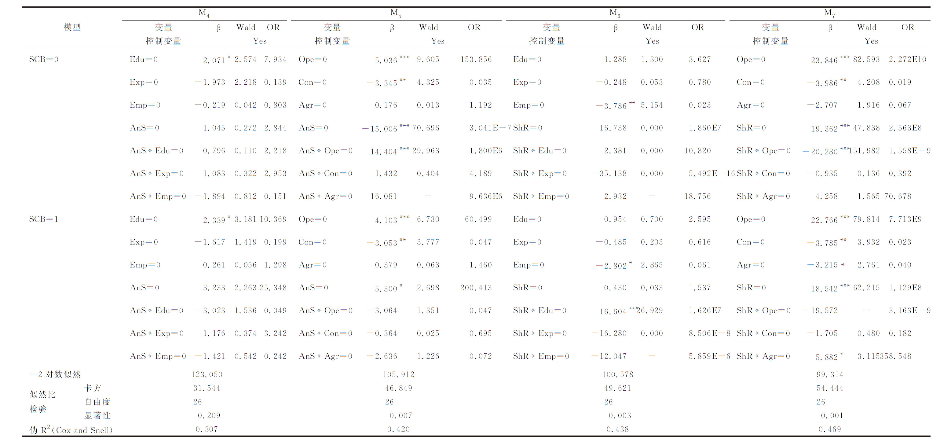 模型M4变量βWaldOR控制变量YesM5变量βWaldOR控制变量YesM6变量βWaldOR控制变量YesM7变量βWaldOR控制变量YesSCB=0Edu=02.071*2.5747.934Ope=05.036***9.605153.856Edu=01.2881.3003.627Ope=023.846***82.5932.272E10Exp=0-1.9732.2180.139Con=0-3.345**4.3250.035Exp=0-0.2480.0530.780Con=0-3.986**4.2080.019Emp=0-0.2190.0420.803Agr=00.1760.0131.192Emp=0-3.786**5.1540.023Agr=0-2.7071.9160.067AnS=01.0450.2722.844AnS=0-15.006***70.6963.041E-7ShR=016.7380.0001.860E7ShR=019.362***47.8382.563E8AnS*Edu=00.7960.1102.218AnS*Ope=014.404***29.9631.800E6ShR*Edu=02.3810.00010.820ShR*Ope=0-20.280***151.9821.558E-9AnS*Exp=01.0830.3222.953AnS*Con=01.4320.4044.189ShR*Exp=0-35.1380.0005.492E-16ShR*Con=0-0.9350.1360.392AnS*Emp=0-1.8940.8120.151AnS*Agr=016.081-9.636E6ShR*Emp=02.932-18.756ShR*Agr=04.2581.56570.678SCB=1Edu=02.339*3.18110.369Ope=04.103***6.73060.499Edu=00.9540.7002.595Ope=022.766***79.8147.713E9Exp=0-1.6171.4190.199Con=0-3.053**3.7770.047Exp=0-0.4850.2030.616Con=0-3.785**3.9320.023Emp=00.2610.0561.298Agr=00.3790.0631.460Emp=0-2.802*2.8650.061Agr=0-3.215*2.7610.040AnS=03.2332.26325.348AnS=05.300*2.698200.413ShR=00.4300.0331.537ShR=018.542***62.2151.129E8AnS*Edu=0-3.0231.5360.049AnS*Ope=0-3.0641.3510.047ShR*Edu=016.604***26.9291.626E7ShR*Ope=0-19.572-3.163E-9AnS*Exp=01.1760.3743.242AnS*Con=0-0.3640.0250.695ShR*Exp=0-16.2800.0008.506E-8ShR*Con=0-1.7050.4800.182AnS*Emp=0-1.4210.5420.242AnS*Agr=0-2.6361.2260.072ShR*Emp=0-12.047-5.859E-6ShR*Agr=05.882*3.115358.548-2对数似然123.050105.912100.57899.314卡方31.54446.84949.62154.444似然比检验自由度26262626显著性0.2090.0070.0030.001伪R2(Cox and Snell)0.3070.4200.4380.469