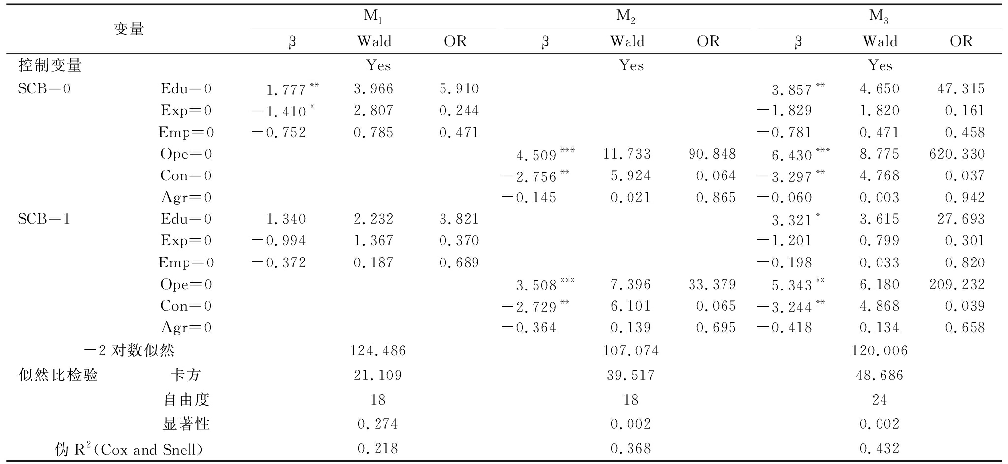 变量M1βWaldORM2βWaldORM3βWaldOR控制变量YesYesYesSCB=0Edu=01.777**3.9665.9103.857**4.65047.315Exp=0-1.410*2.8070.244-1.8291.8200.161Emp=0-0.7520.7850.471-0.7810.4710.458Ope=04.509***11.73390.8486.430***8.775620.330Con=0-2.756**5.9240.064-3.297**4.7680.037Agr=0-0.1450.0210.865-0.0600.0030.942SCB=1Edu=01.3402.2323.8213.321*3.61527.693Exp=0-0.9941.3670.370-1.2010.7990.301Emp=0-0.3720.1870.689-0.1980.0330.820Ope=03.508***7.39633.3795.343**6.180209.232Con=0-2.729**6.1010.065-3.244**4.8680.039Agr=0-0.3640.1390.695-0.4180.1340.658-2对数似然124.486107.074120.006似然比检验卡方21.10939.51748.686自由度181824显著性0.2740.0020.002伪R2(Cox and Snell)0.2180.3680.432