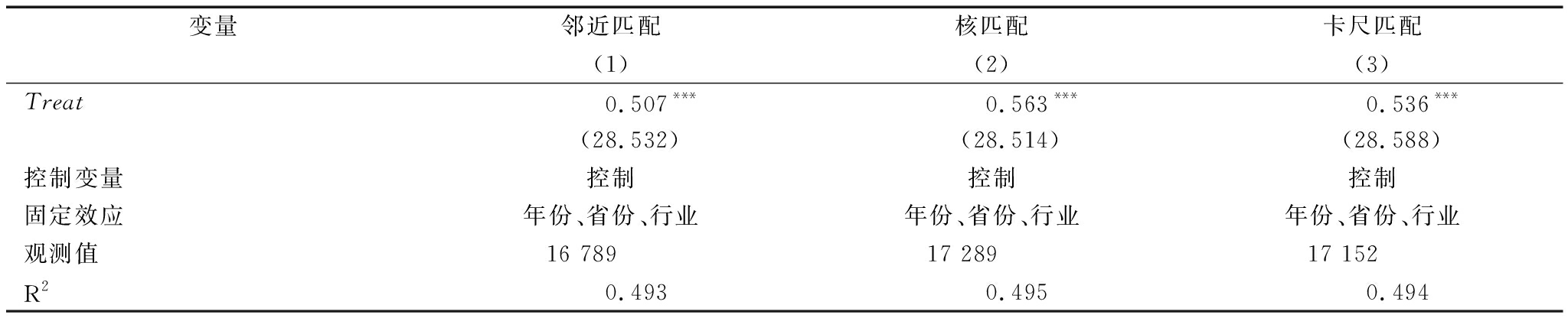变量邻近匹配核匹配卡尺匹配(1)(2)(3)Treat0.507***0.563***0.536***(28.532)(28.514)(28.588)控制变量控制控制控制固定效应年份、省份、行业年份、省份、行业年份、省份、行业观测值16 78917 28917 152R20.4930.4950.494