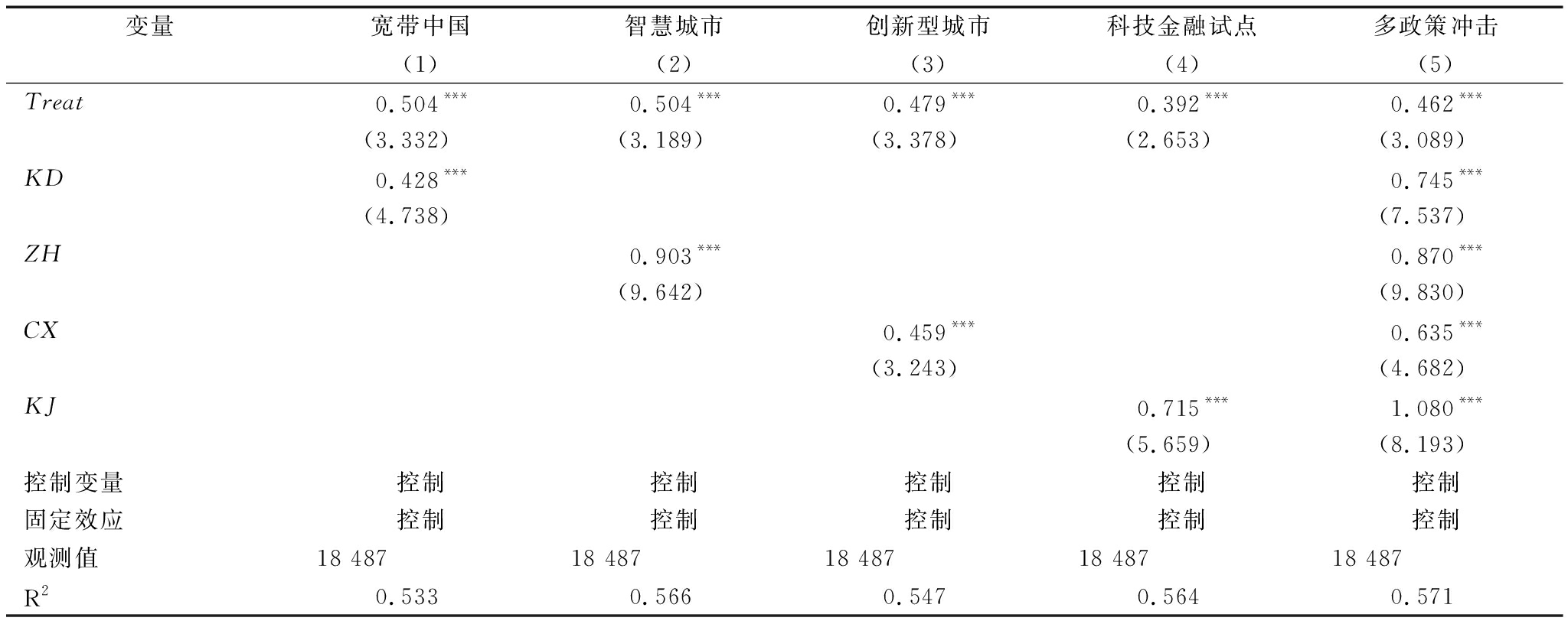 变量宽带中国智慧城市创新型城市科技金融试点多政策冲击(1)(2)(3)(4)(5)Treat0.504***0.504***0.479***0.392***0.462***(3.332)(3.189)(3.378)(2.653)(3.089)KD0.428***0.745***(4.738)(7.537)ZH0.903***0.870***(9.642)(9.830)CX0.459***0.635***(3.243)(4.682)KJ0.715***1.080***(5.659)(8.193)控制变量控制控制控制控制控制固定效应控制控制控制控制控制观测值18 48718 48718 48718 48718 487R20.5330.5660.5470.5640.571