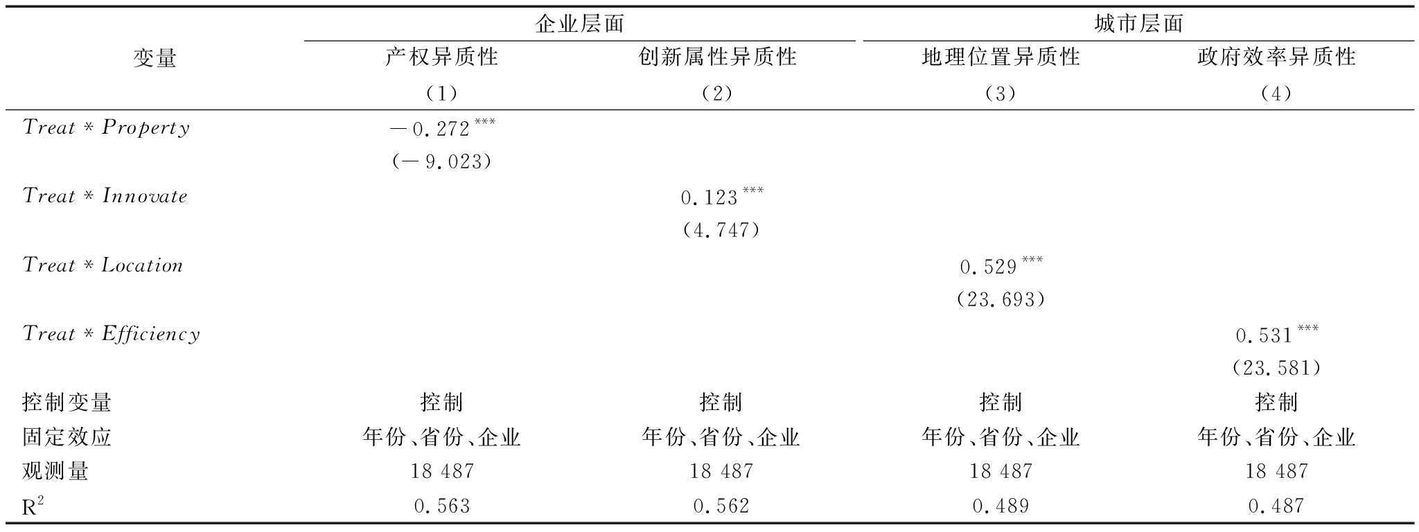 变量企业层面产权异质性(1)创新属性异质性(2)城市层面地理位置异质性(3)政府效率异质性(4)Treat*Property-0.272***(-9.023)Treat*Innovate0.123***(4.747)Treat*Location0.529***(23.693)Treat*Efficiency0.531***(23.581)控制变量控制控制控制控制固定效应年份、省份、企业年份、省份、企业年份、省份、企业年份、省份、企业观测量18 48718 48718 48718 487R20.5630.5620.4890.487