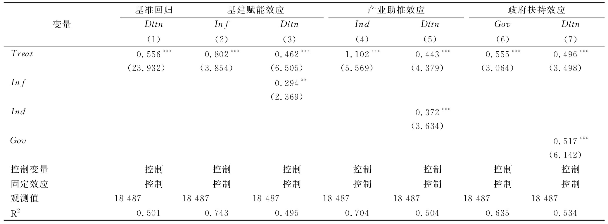 变量基准回归Dltn(1)基建赋能效应Inf(2)Dltn(3)产业助推效应Ind(4)Dltn(5)政府扶持效应Gov(6)Dltn(7)Treat0.556***0.802***0.462***1.102***0.443***0.555***0.496***(23.932)(3.854)(6.505)(5.569)(4.379)(3.064)(3.498)Inf0.294**(2.369)Ind0.372***(3.634)Gov0.517***(6.142)控制变量控制控制控制控制控制控制控制固定效应控制控制控制控制控制控制控制观测值18 48718 48718 48718 48718 48718 48718 487R20.5010.7430.4950.7040.5040.6350.534