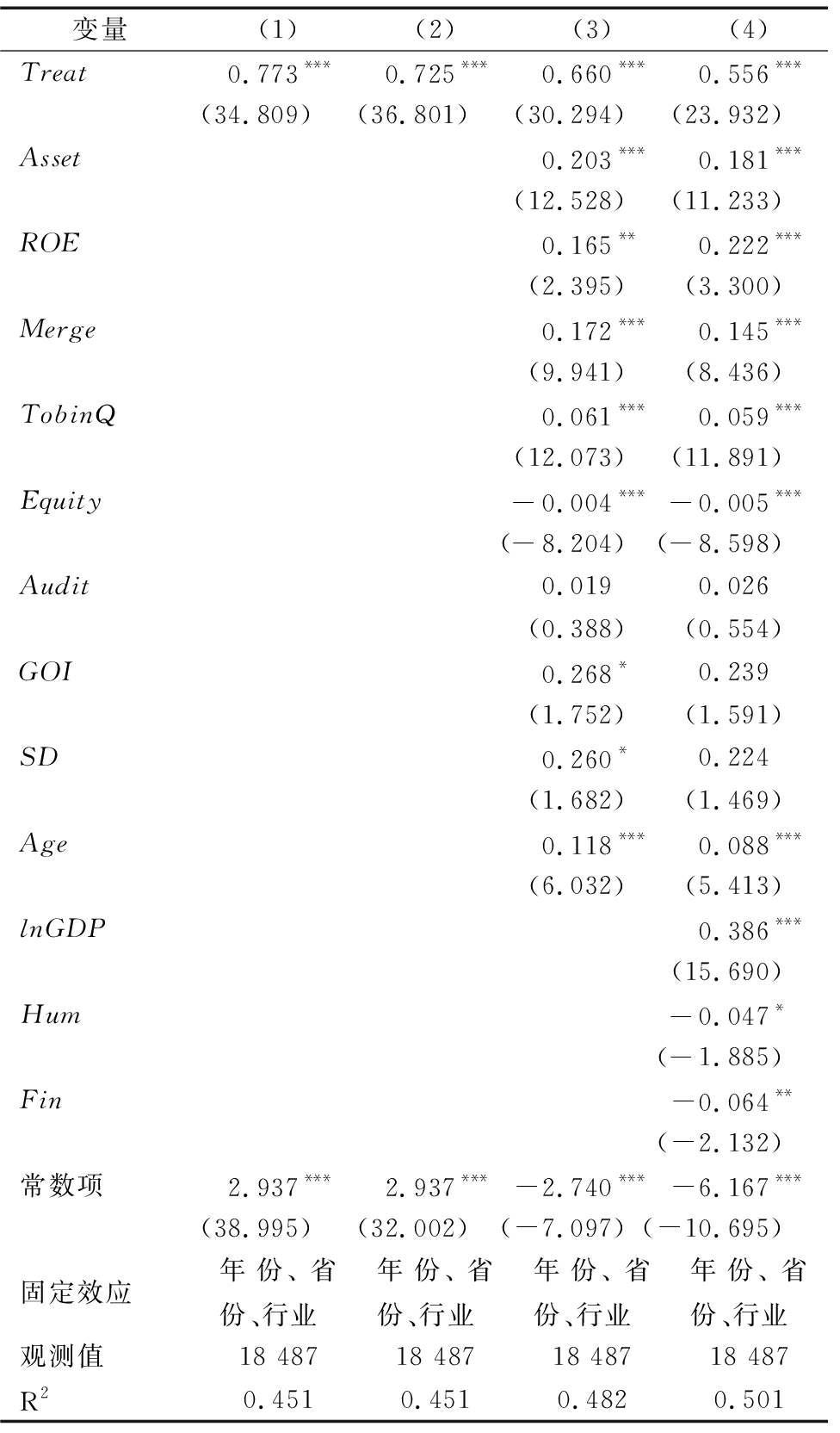 变量(1)(2)(3)(4)Treat0.773***0.725***0.660***0.556***(34.809)(36.801)(30.294)(23.932)Asset0.203***0.181***(12.528)(11.233)ROE0.165**0.222***(2.395)(3.300)Merge0.172***0.145***(9.941)(8.436)TobinQ0.061***0.059***(12.073)(11.891)Equity-0.004***-0.005***(-8.204)(-8.598)Audit0.0190.026(0.388)(0.554)GOI0.268*0.239(1.752)(1.591)SD0.260*0.224(1.682)(1.469)Age0.118***0.088***(6.032)(5.413)lnGDP0.386***(15.690)Hum-0.047*(-1.885)Fin-0.064**(-2.132)常数项2.937***2.937***-2.740***-6.167***(38.995)(32.002)(-7.097)(-10.695)固定效应年份、省份、行业年份、省份、行业年份、省份、行业年份、省份、行业观测值18 48718 48718 48718 487R20.4510.4510.4820.501