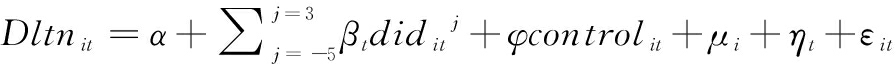双重差分模型能够准确评估政策效应的前提是保证研究样本满足平行趋势检验,即在不存在政策冲击时,试点城市与非试点城市在时间发展趋势上具有一致性,并不会随时间推移产生系统性差异。为此,本文参考徐林等[6]的研究思路,通过事件研究法构建如下动态模型: