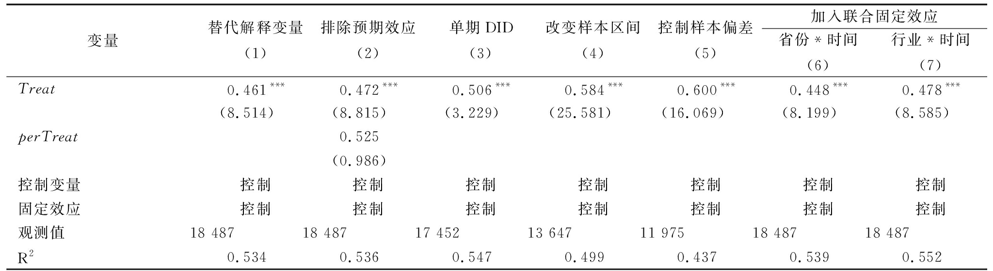 变量替代解释变量(1)排除预期效应(2)单期DID(3)改变样本区间(4)控制样本偏差(5)加入联合固定效应省份*时间(6)行业*时间(7)Treat0.461***0.472***0.506***0.584***0.600***0.448***0.478***(8.514)(8.815)(3.229)(25.581)(16.069)(8.199)(8.585)perTreat0.525(0.986)控制变量控制控制控制控制控制控制控制固定效应控制控制控制控制控制控制控制观测值18 48718 48717 45213 64711 97518 48718 487R20.5340.5360.5470.4990.4370.5390.552