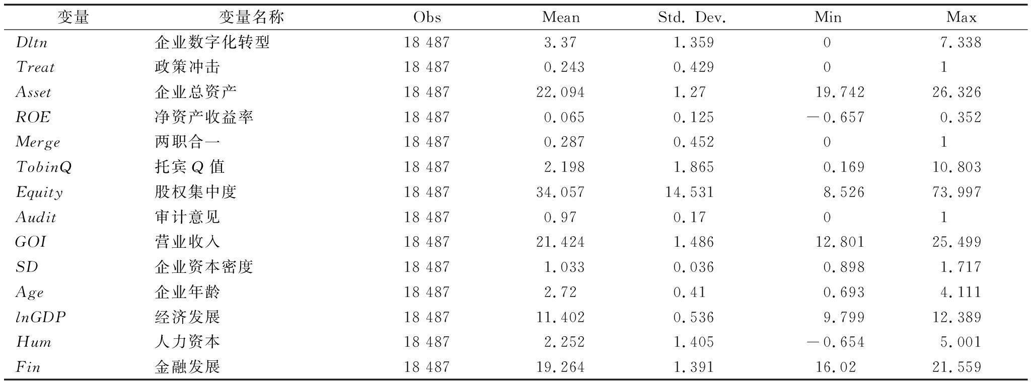 变量变量名称ObsMeanStd. Dev.MinMaxDltn企业数字化转型18 4873.371.35907.338Treat政策冲击18 4870.2430.42901Asset企业总资产18 48722.0941.2719.74226.326ROE净资产收益率18 4870.0650.125-0.6570.352Merge两职合一18 4870.2870.45201TobinQ托宾Q值18 4872.1981.8650.16910.803Equity股权集中度18 48734.05714.5318.52673.997Audit审计意见18 4870.970.1701GOI营业收入18 48721.4241.48612.80125.499SD企业资本密度18 4871.0330.0360.8981.717Age企业年龄18 4872.720.410.6934.111lnGDP经济发展18 48711.4020.5369.79912.389Hum人力资本18 4872.2521.405-0.6545.001Fin金融发展18 48719.2641.39116.0221.559