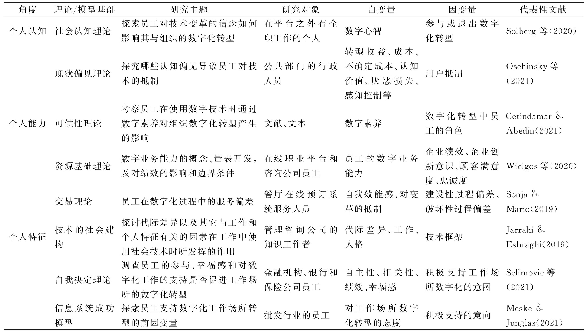 大量研究成果集中在探究影响员工数字化转型的个人因素方面,主要考察认知、能力和个人特征3个维度。研究依赖的理论基础主要有:社会认知理论(Social Cognitive Theory)、可供性理论(Affordance Theory)、自我决定理论(Self-determination Theory)、现状偏见理论(Status Quo Bias Theory)、资源基础理论(Resource-Based Theory)和交易理论(Transactions Theory)等,如表1所示。