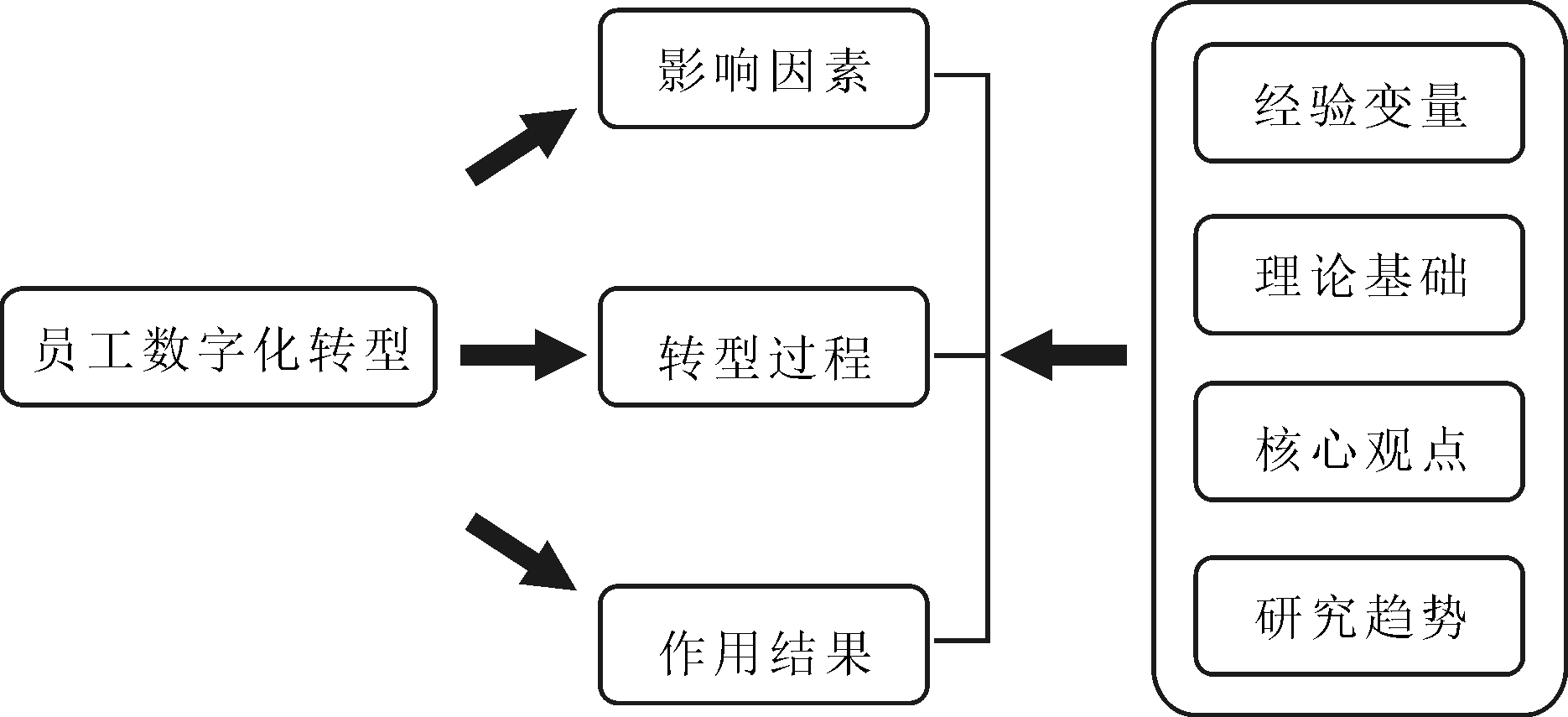 因此,员工数字化转型的概念既强调转型依赖于信息和技术,又强调触发员工属性重大变化并提升员工个人能力。员工数字化转型不仅意味着工作活动中使用数字工具,而且可以提升个人能力、改变工作活动和流程的本质(Selimovi′c,2021)。员工数字化转型不只是人与技术的互动,而是以工作目标为导向,提高员工数字化思维、工作能力,促进组织数字化转型,最终影响组织整体发展。在数字技术不断创新的背景下,员工数字化转型也在悄然发生。系统梳理领域内文献,科学把握这一转型过程,有助于员工和组织应对数字技术带来的重大变革。