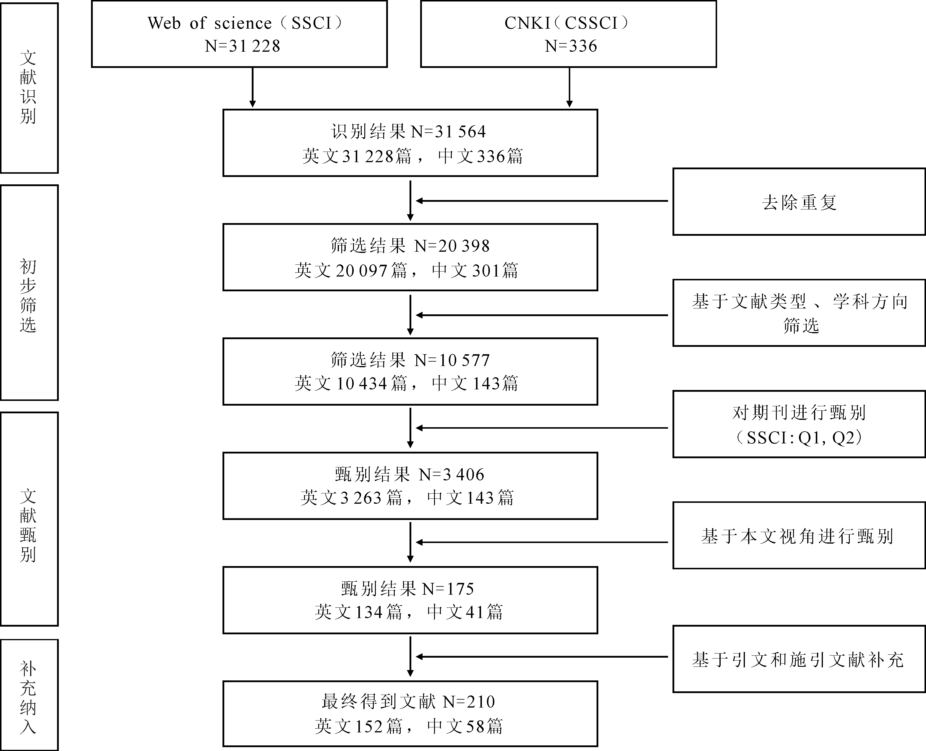 为了系统梳理有关员工数字化转型的文献,本文采用系统性综述和可视化文献分析相结合的方法,在Web of Science和中国知网数据库检索相关文献,要求在主题、标题、摘要或关键词中含有与员工数字化转型相关的“digital”(或二级词汇“bigdata,artificial intelligence,cloud computing,blockchain,Internet platform”)和与员工相关的“employees,workers,practitioners,workforce,digital gigs,digital laborers,staff”词组组成的英文关键词以及相应的中文关键词,例如“digital employees”(李明洋,2022;李树,2022)。同时,筛选研究领域为管理、商业、信息系统、心理学、社会学等方面的文献。数字化转型实践于21世纪逐渐开展,因此,本文研究的文献时间跨度为2002—2022年。截至2022年底,检索到外文文献10 434篇、中文文献143篇。通过阅读题目、摘要、关键词、研究结论等,剔除与员工数字化转型关联性不强的文献,最终选出134篇英文文献和41篇中文文献。通过追溯文献引文和施引文,补充符合条件的中英文文献35篇,最后,获得152篇英文和58篇中文文献作为分析对象。文献筛选流程如图1所示。