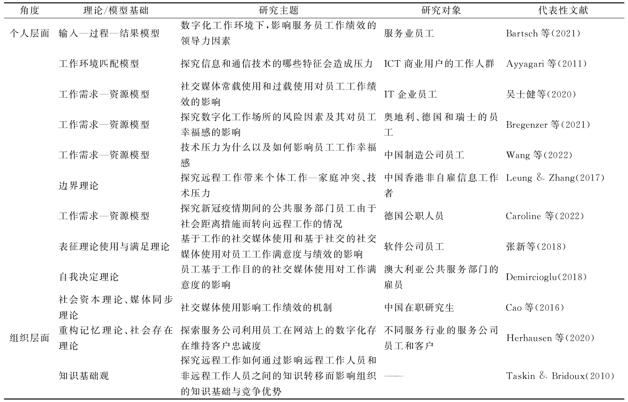 角度理论/模型基础研究主题研究对象代表性文献个人层面输入—过程—结果模型数字化工作环境下,影响服务员工作绩效的领导力因素服务业员工Bartsch等(2021)工作环境匹配模型探究信息和通信技术的哪些特征会造成压力ICT商业用户的工作人群Ayyagari等(2011)工作需求—资源模型社交媒体常载使用和过载使用对员工工作绩效的影响IT企业员工吴士健等(2020)工作需求—资源模型探究数字化工作场所的风险因素及其对员工幸福感的影响奥地利、德国和瑞士的员工Bregenzer等(2021)工作需求—资源模型技术压力为什么以及如何影响员工工作幸福感中国制造公司员工Wang等(2022)边界理论探究远程工作带来个体工作—家庭冲突、技术压力中国香港非自雇信息工作者Leung & Zhang(2017)工作需求—资源模型探究新冠疫情期间的公共服务部门员工由于社会距离措施而转向远程工作的情况德国公职人员Caroline 等(2022)表征理论使用与满足理论基于工作的社交媒体使用和基于社交的社交媒体使用对员工工作满意度与绩效的影响软件公司员工张新等(2018)自我决定理论员工基于工作目的的社交媒体使用对工作满意度的影响澳大利亚公共服务部门的雇员Demircioglu(2018)社会资本理论、媒体同步理论社交媒体使用影响工作绩效的机制中国在职研究生Cao等(2016)组织层面重构记忆理论、社会存在理论探索服务公司利用员工在网站上的数字化存在维持客户忠诚度不同服务行业的服务公司员工和客户Herhausen等(2020)知识基础观探究远程工作如何通过影响远程工作人员和非远程工作人员之间的知识转移而影响组织的知识基础与竞争优势———Taskin & Bridoux(2010)