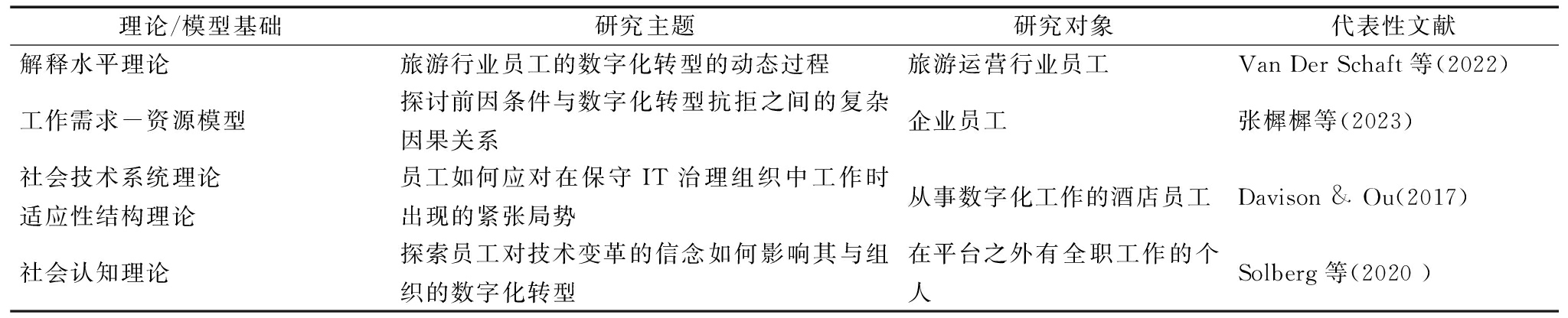 其次,在数字化转型过程中,员工会扮演不同角色,产生不同情感体验。离开者和怀疑论者会避免数字化转型;合作者会与数字化转型接触,但要通过他人找到能够帮助其使用新技术的合作伙伴(或团队);掌管者表现为专注于数字化转型,专注于自我,努力成为新技术和新流程方面的专家;变革者积极参与数字化转型,与他人合作和创造,帮助对改变持怀疑态度的人[11]。此外,情绪在转型过程中的影响也受到学界关注。员工在工作场所与聊天机器人协作完成任务的过程中,面对机器人不同表现,员工会产生同情、宽恕、善意等关联情绪、快乐和愉悦等满足情绪,会体验到兴奋、好奇和嬉戏等娱乐情绪以及不满、烦恼和沮丧等挫折情绪[20]。员工数字化转型过程相关研究主要依赖的理论基础如表2所示。