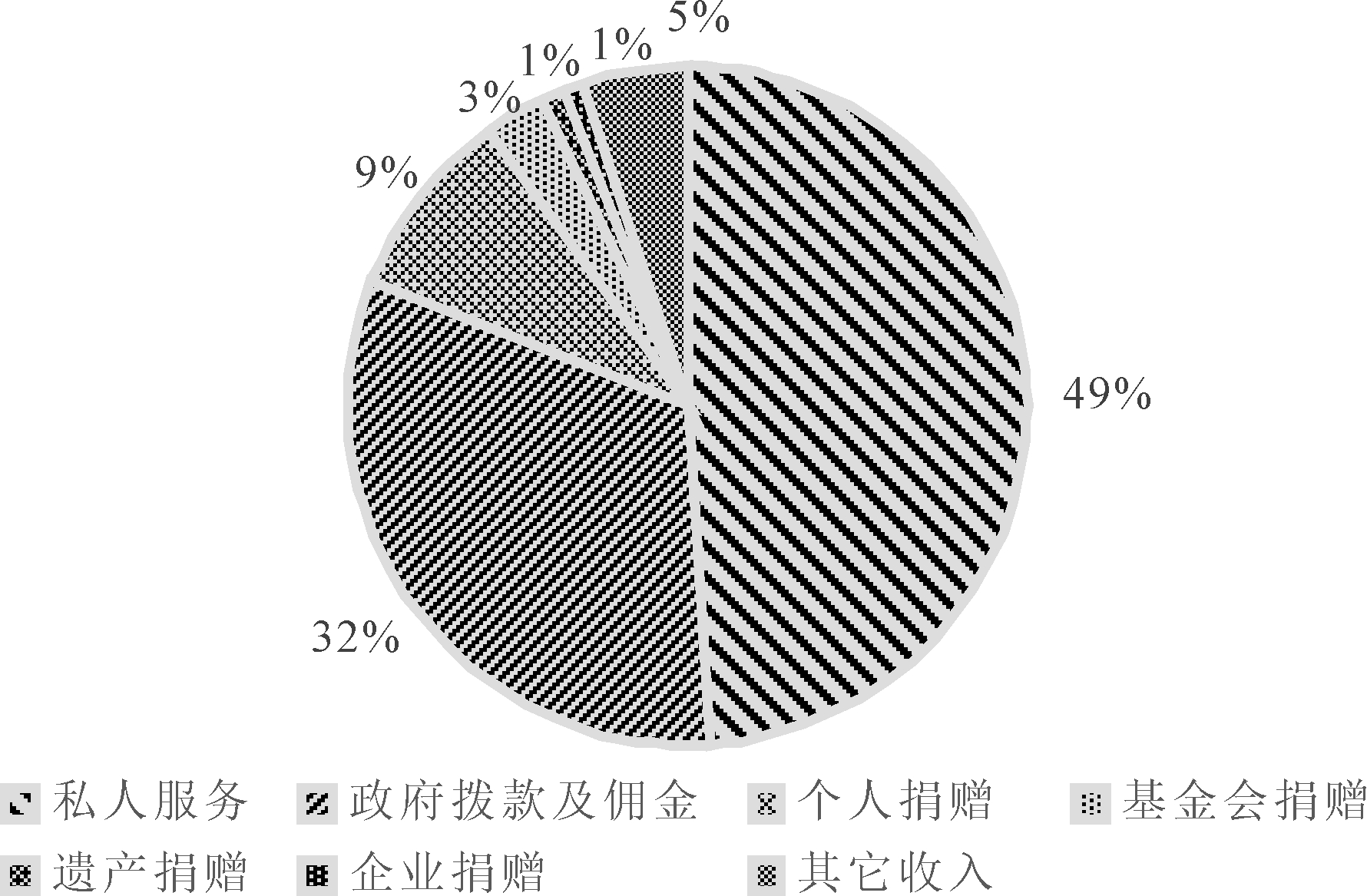 美国非营利组织资金来源于3个方面:收费服务、接受捐赠以及其它获取收入的方式。收费服务由两部分组成:一是赚取私人服务费,此项收入最多,占总资金的49%,且这笔收入大部分投入非营利医院和高等教育;二是政府拨款及佣金,此项收入是政府付给非营利组织为公众提供服务的费用,占全部收入的32%。社会捐赠包括个人捐赠(9%)、基金会捐赠(3%)、遗产捐赠(1%)、企业捐赠(1%)和其它收入(5%)[16],如图3所示。