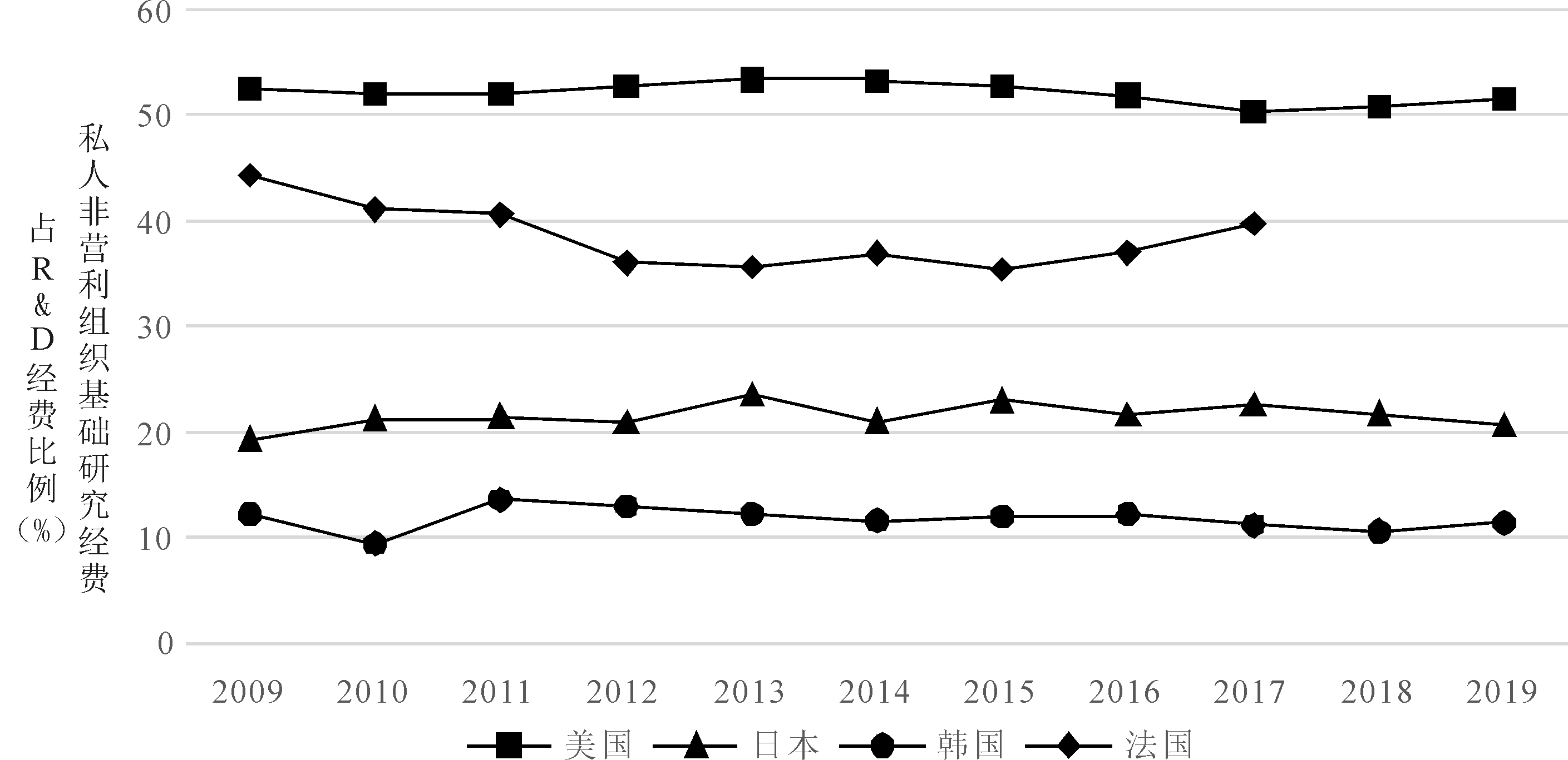 图5 2009-2019年4国非营利组织捐赠基础研究经费占R&D经费的比例