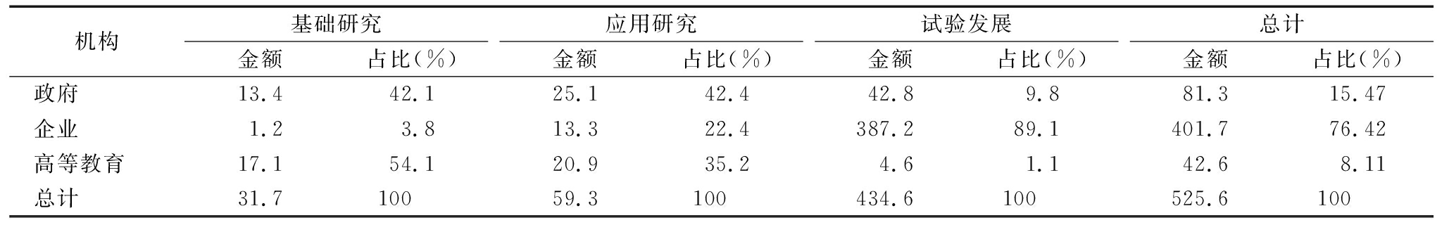 机构基础研究金额占比(%)应用研究金额占比(%)试验发展金额占比(%)总计金额占比(%)政府13.442.125.142.442.89.881.315.47企业1.23.813.322.4387.289.1401.776.42高等教育17.154.120.935.24.61.142.68.11总计31.710059.3100434.6100525.6100