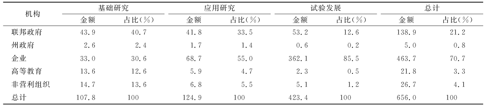机构基础研究金额占比(%)应用研究金额占比(%)试验发展金额占比(%)总计金额占比(%)联邦政府43.940.741.833.553.212.6138.921.2州政府2.62.41.71.40.60.25.00.8企业33.030.668.755.0362.185.5463.770.7高等教育13.612.65.94.72.30.521.83.3非营利组织14.713.66.85.55.11.226.74.1总计107.8100124.9100423.4100656.0100