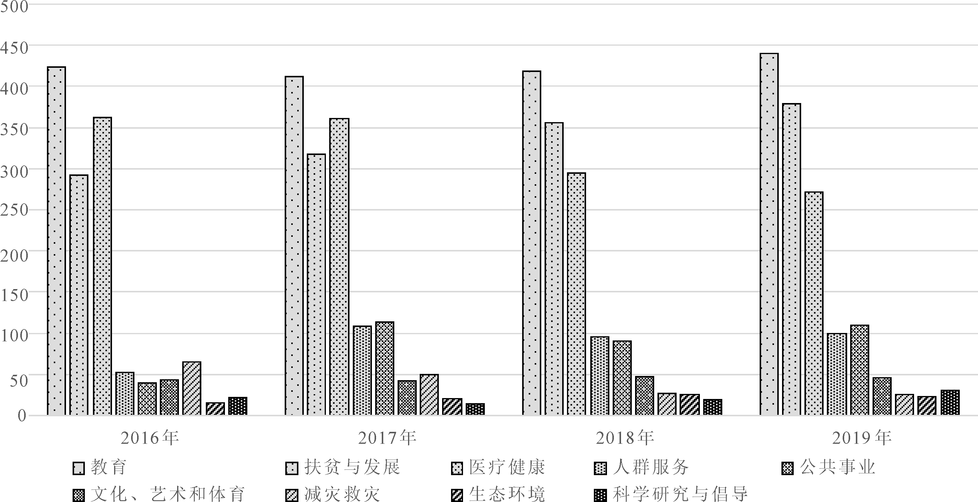 图4 2016-2019年我国各慈善领域捐赠接收情况