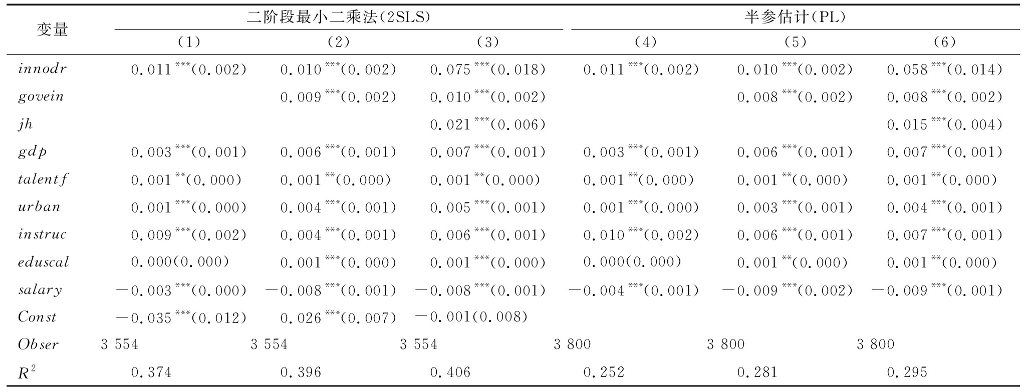区域人才配置、政府干预、创新驱动三者之间存在复杂的互动关系,因而模型变量之间可能存在内生性问题。二阶段最小二乘法(2SLS)能够通过寻求工具变量解决模型内生性问题,考虑到滞后一期的政府干预、创新驱动与当期政府干预、创新驱动水平密切相关,而且难以对当期人才配置产生影响,因而选取政府干预和创新驱动的滞后一期作为工具变量。面板数据模型能够综合考察对象在时间序列和横截面上的波动规律,增强估计的有效性[30]。基于此,使用2SLS方法对创新驱动和政府干预对区域人才配置的影响进行验证,结果如表2所示。