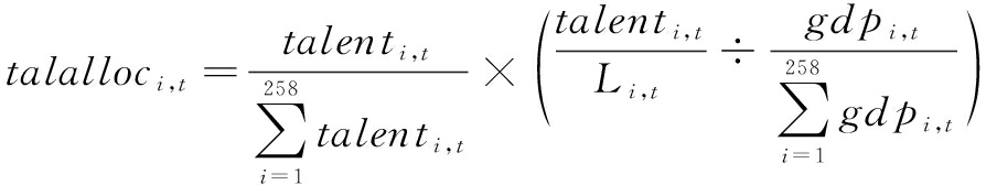 其中,talalloci,t为i地区t时期人才配置水平,talenti,t为i地区t时期人才数量,Li,t为i地区t时期就业人数,gdpi,t为i地区t时期生产总值。