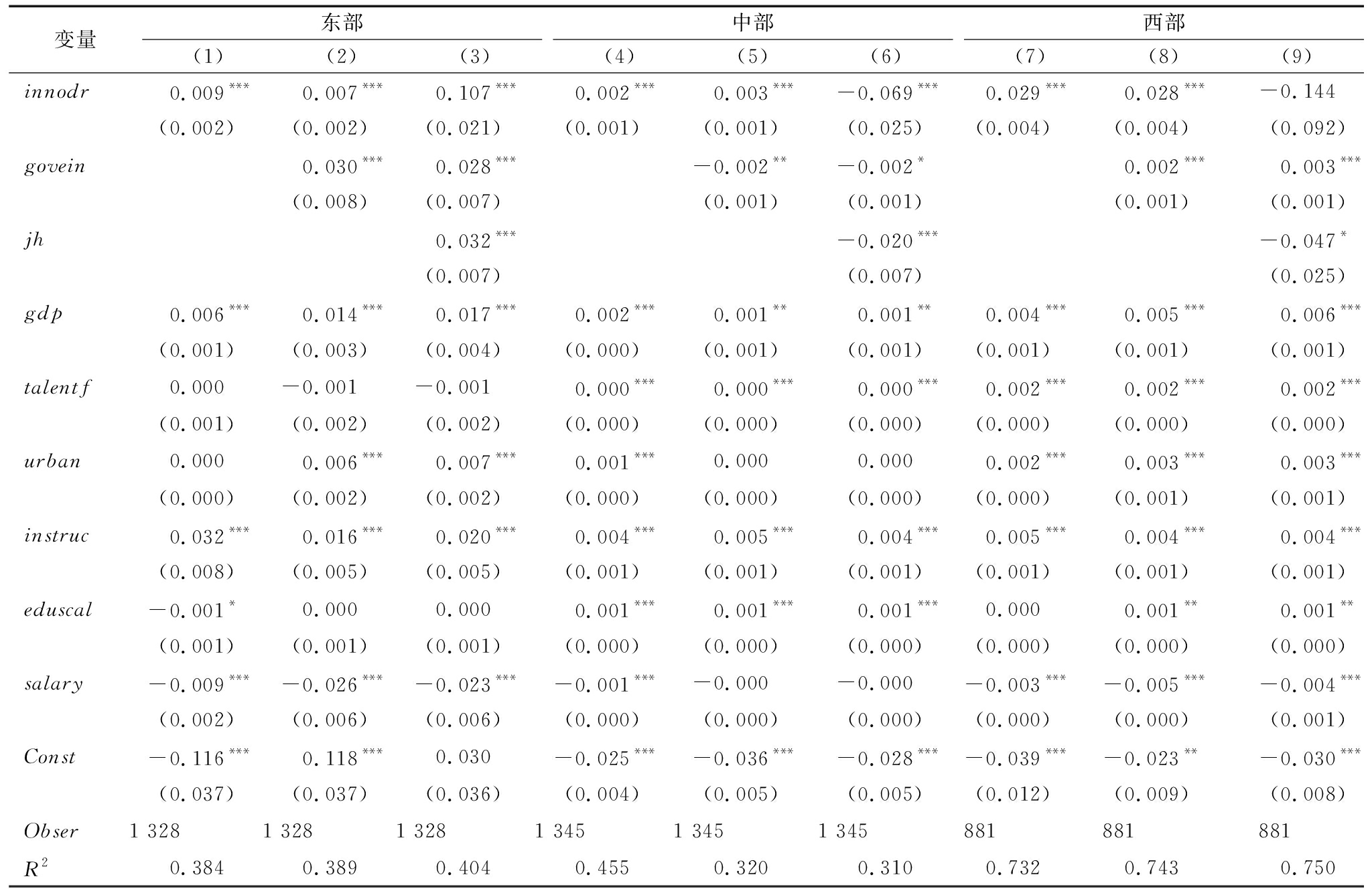 变量东部(1)(2)(3)中部(4)(5)(6)西部(7)(8)(9)innodr0.009***0.007***0.107***0.002***0.003***-0.069***0.029***0.028***-0.144(0.002)(0.002)(0.021)(0.001)(0.001)(0.025)(0.004)(0.004)(0.092)govein0.030***0.028***-0.002**-0.002*0.002***0.003***(0.008)(0.007)(0.001)(0.001)(0.001)(0.001)jh0.032***-0.020***-0.047*(0.007)(0.007)(0.025)gdp0.006***0.014***0.017***0.002***0.001**0.001**0.004***0.005***0.006***(0.001)(0.003)(0.004)(0.000)(0.001)(0.001)(0.001)(0.001)(0.001)talentf0.000-0.001-0.0010.000***0.000***0.000***0.002***0.002***0.002***(0.001)(0.002)(0.002)(0.000)(0.000)(0.000)(0.000)(0.000)(0.000)urban0.0000.006***0.007***0.001***0.0000.0000.002***0.003***0.003***(0.000)(0.002)(0.002)(0.000)(0.000)(0.000)(0.000)(0.001)(0.001)instruc0.032***0.016***0.020***0.004***0.005***0.004***0.005***0.004***0.004***(0.008)(0.005)(0.005)(0.001)(0.001)(0.001)(0.001)(0.001)(0.001)eduscal-0.001*0.0000.0000.001***0.001***0.001***0.0000.001**0.001**(0.001)(0.001)(0.001)(0.000)(0.000)(0.000)(0.000)(0.000)(0.000)salary-0.009***-0.026***-0.023***-0.001***-0.000-0.000-0.003***-0.005***-0.004***(0.002)(0.006)(0.006)(0.000)(0.000)(0.000)(0.000)(0.000)(0.001)Const-0.116***0.118***0.030-0.025***-0.036***-0.028***-0.039***-0.023**-0.030***(0.037)(0.037)(0.036)(0.004)(0.005)(0.005)(0.012)(0.009)(0.008)Obser1 3281 3281 3281 3451 3451 345881881881R20.3840.3890.4040.4550.3200.3100.7320.7430.750