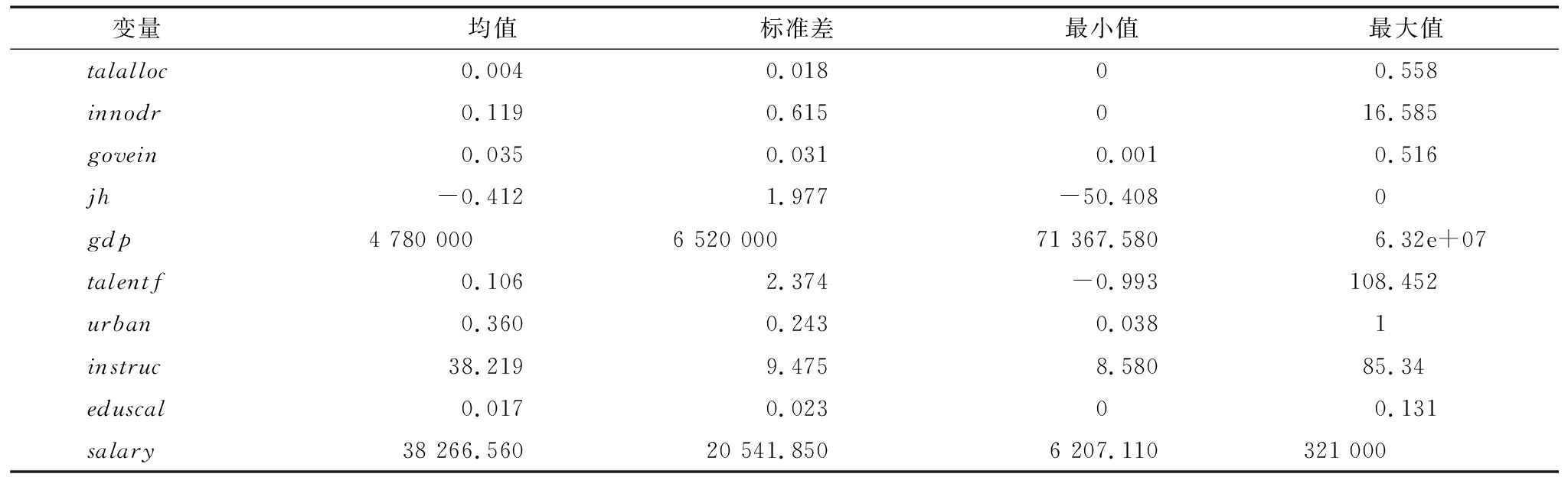 其中,talalloci,t为区域人才配置水平,innodri,t为创新驱动水平,goveini,t为政府干预水平,jhi,t为创新驱动和政府干预的交互项,controls为控制变量,包括经济发展水平(gdp)、人才流动水平(talentf)、城镇化水平 (urban)、产业结构高级化(instruc)、高等教育规模(eduscal)、区域薪酬激励(salary),εi,t为模型的随机扰动项,下标t为时间,i为地区,βi为模型的待估计参数。