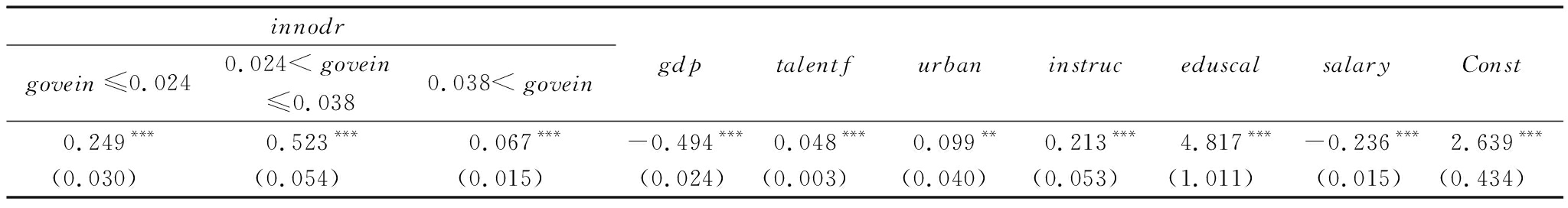 根据上述实证结果可知,不同地区的回归结果在加入政府干预后出现不同程度变化,这与不同地区政府干预程度迥异的现象不谋而合。基于此,本文认为创新驱动对区域人才配置的效应受到政府干预程度的影响,存在政府干预的门限效应,因而,采用门限回归进一步检验创新驱动在不同政府干预水平下对区域人才配置的影响,结果如表4所示。
