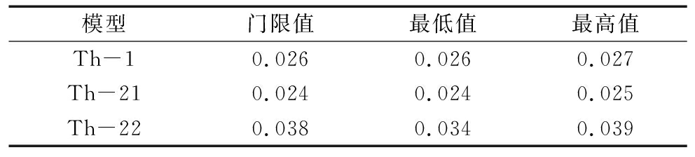 模型门限值最低值最高值Th-10.0260.0260.027Th-210.0240.0240.025Th-220.0380.0340.039