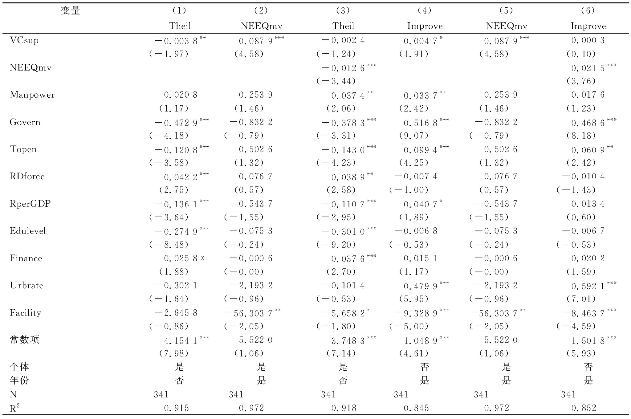变量(1)(2)(3)(4)(5)(6)TheilNEEQmvTheilImproveNEEQmvImproveVCsup-0.003 8**0.087 9***-0.002 40.004 7*0.087 9***0.000 3(-1.97)(4.58)(-1.24)(1.91)(4.58)(0.10)NEEQmv-0.012 6***0.021 5***(-3.44)(3.76)Manpower0.020 80.253 90.037 4**0.033 7**0.253 90.017 6(1.17)(1.46)(2.06)(2.42)(1.46)(1.23)Govern-0.472 9***-0.832 2-0.378 3***0.516 8***-0.832 20.468 6***(-4.18)(-0.79)(-3.31)(9.07)(-0.79)(8.18)Topen-0.120 8***0.502 6-0.143 0***0.099 4***0.502 60.060 9**(-3.58)(1.32)(-4.23)(4.25)(1.32)(2.42)RDforce0.042 2***0.076 70.038 9**-0.007 40.076 7-0.010 4(2.75)(0.57)(2.58)(-1.00)(0.57)(-1.43)RperGDP-0.136 1***-0.543 7-0.110 7***0.040 7*-0.543 70.013 4(-3.64)(-1.55)(-2.95)(1.89)(-1.55)(0.60)Edulevel-0.274 9***-0.075 3-0.301 0***-0.006 8-0.075 3-0.006 7(-8.48)(-0.24)(-9.20)(-0.53)(-0.24)(-0.53)Finance0.025 8*-0.000 60.037 6***0.015 1-0.000 60.020 2(1.88)(-0.00)(2.70)(1.17)(-0.00)(1.59)Urbrate-0.302 1-2.193 2-0.101 40.479 9***-2.193 20.592 1***(-1.64)(-0.96)(-0.53)(5.95)(-0.96)(7.01)Facility-2.645 8-56.303 7**-5.658 2*-9.328 9***-56.303 7**-8.463 7***(-0.86)(-2.05)(-1.80)(-5.00)(-2.05)(-4.59)常数项4.154 1***5.522 03.748 3***1.048 9***5.522 01.501 8***(7.98)(1.06)(7.14)(4.61)(1.06)(5.93)个体是是是否是否年份否是否是是是N341341341341341341R20.9150.9720.9180.8450.9720.852