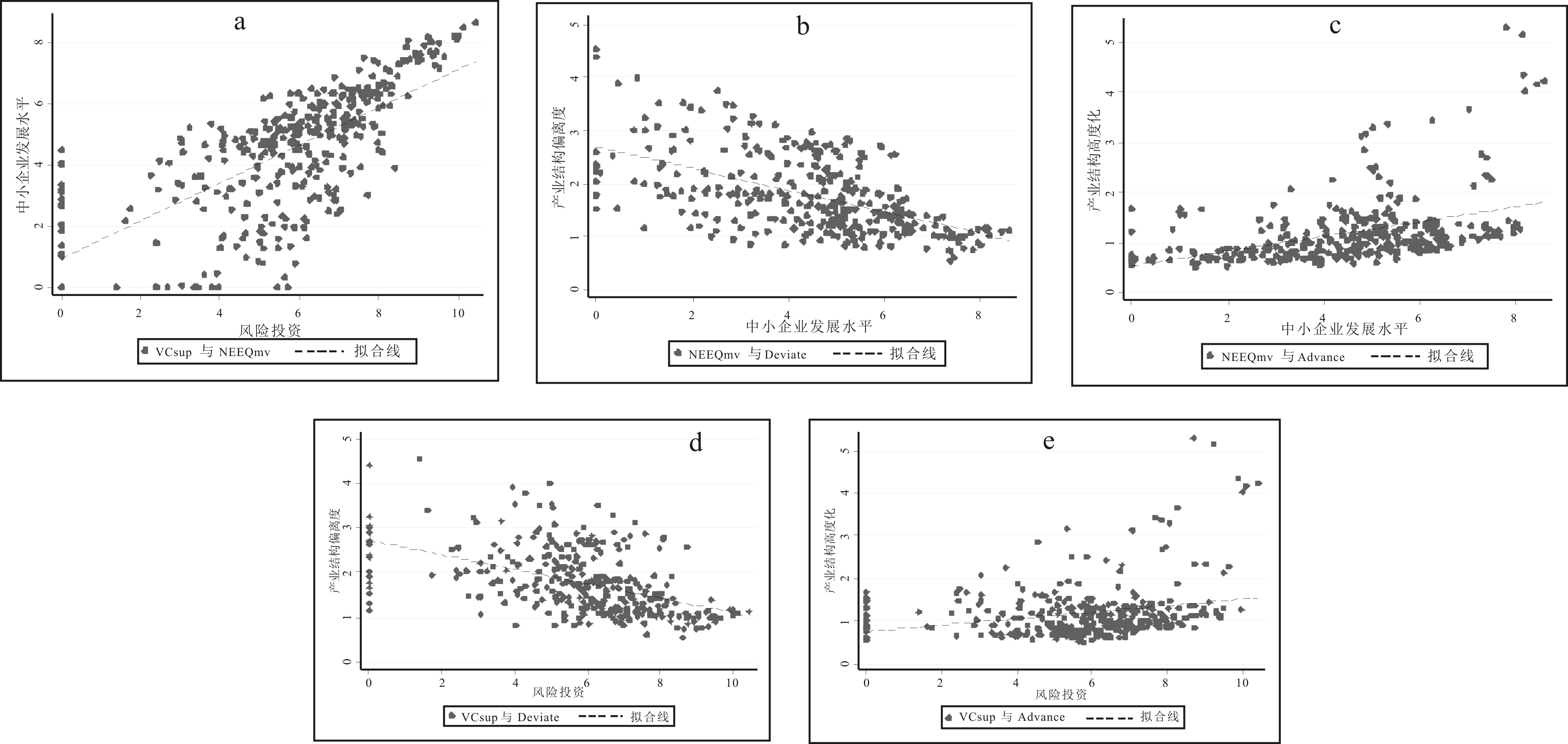进一步,主要变量之间的散点图表明变量之间可能存在相关关系。图2-a为风险投资与中小企业发展水平的散点图,散点相对密集,拟合线呈正相关关系,说明VCsup↑→NEEQmv↑。图2-b为中小企业发展水平与产业结构合理化的散点图,拟合线为负相关关系,说明NEEQmv↑→Deviate↓(结构偏离度降低意味着产业结构合理化水平提高)。图2-c为中小企业发展水平与产业结构高度化的散点图,拟合线为正相关关系,说明NEEQmv↑→Advance↑。图2-a~2-c说明可能存在以下关系:VCsup↑→NEEQmv↑→产业结构优化↑(包括Deviate↓和Advance↑)。图2-d为风险投资与产业结构合理化的散点图,拟合线为负相关关系,说明VCsup↑→Deviate↓。图2-e为风险投资与产业结构高度化的散点图,拟合线为正相关关系,说明VCsup↑→Advance↑。图2-d、2-e说明风险投资与产业结构优化之间存在正向关联。当然,风险投资、中小企业发展与产业结构优化之间的具体关系还需要进一步验证。
