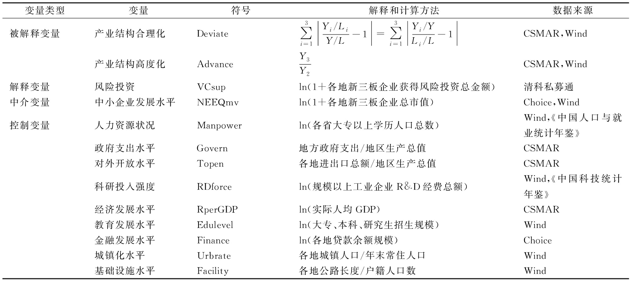 在我国,中小企业不仅是创新创业的主体和市场活力的源泉,还是中国经济韧性和就业韧性的重要支撑。本文从受资中小企业角度切入,研究风险投资对产业结构优化的影响,选取新三板企业数据衡量中小企业发展水平。主要原因在于:首先,新三板设立的初衷是孵化和培育中小微企业,缓解中小微企业的融资约束问题。同时,新三板挂牌企业数量较多,虽然无法达到科创板、创业板、主板上市要求,但仍然希望获得融资与发展。其次,新三板企业作为非上市公众公司,经历过股改、主办券商推荐和持续督导,相比非公众公司,新三板企业治理结构更规范,很多新三板企业被风险投资人锁定为投资目标。因此,可以获得风险投资与受资新三板企业的完整连续数据,为实证研究提供可行基础。鉴于以上因素,本文选择2010—2020年我国内地31个省份数据,通过量化风险投资、中小企业发展和产业结构优化各项指标进行研究。由于部分变量在部分年度存在缺漏值,以每个省份该变量的样本均值替代缺漏值,数据处理及实证检验过程均通过Stata16.1实现。