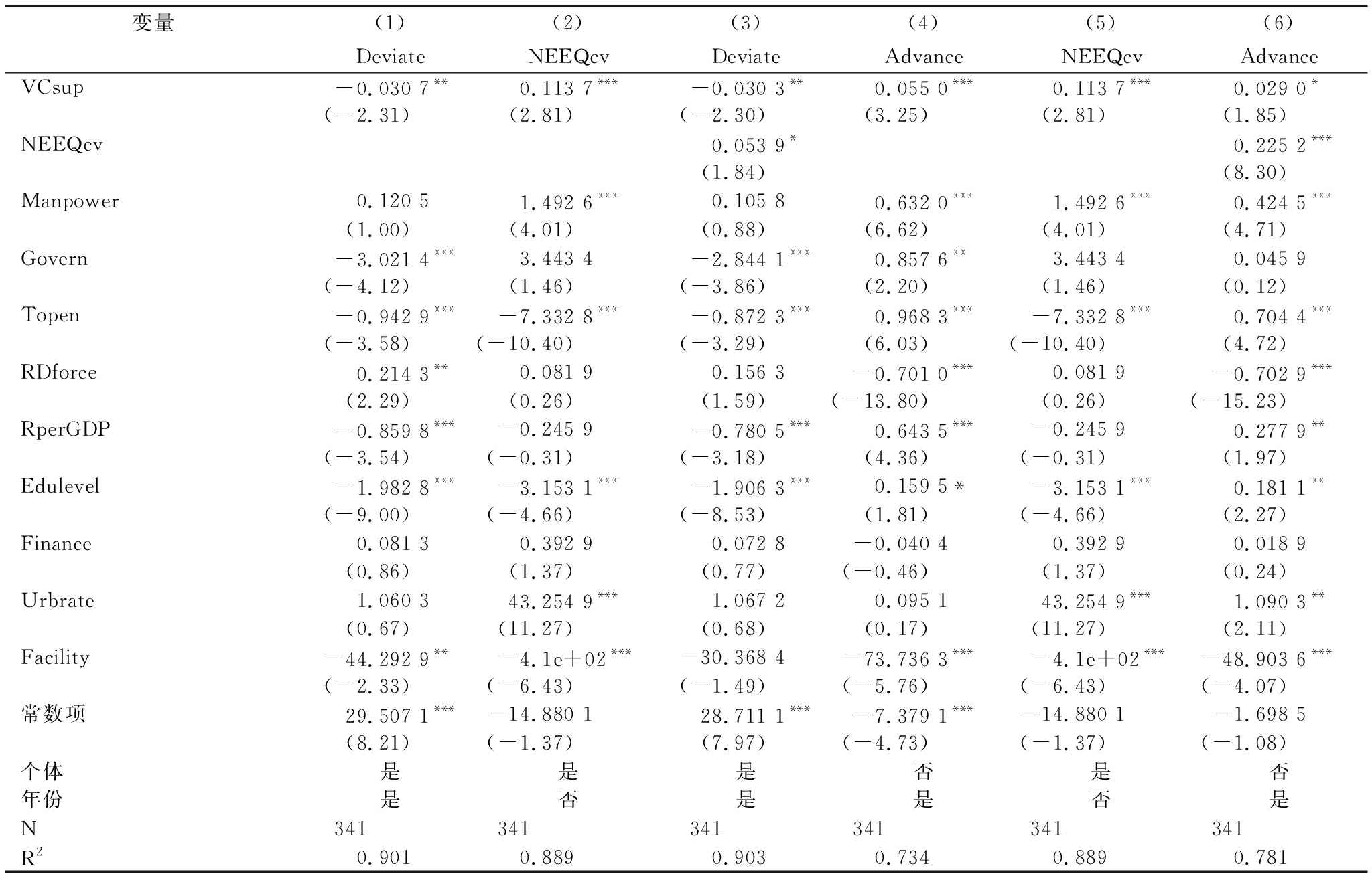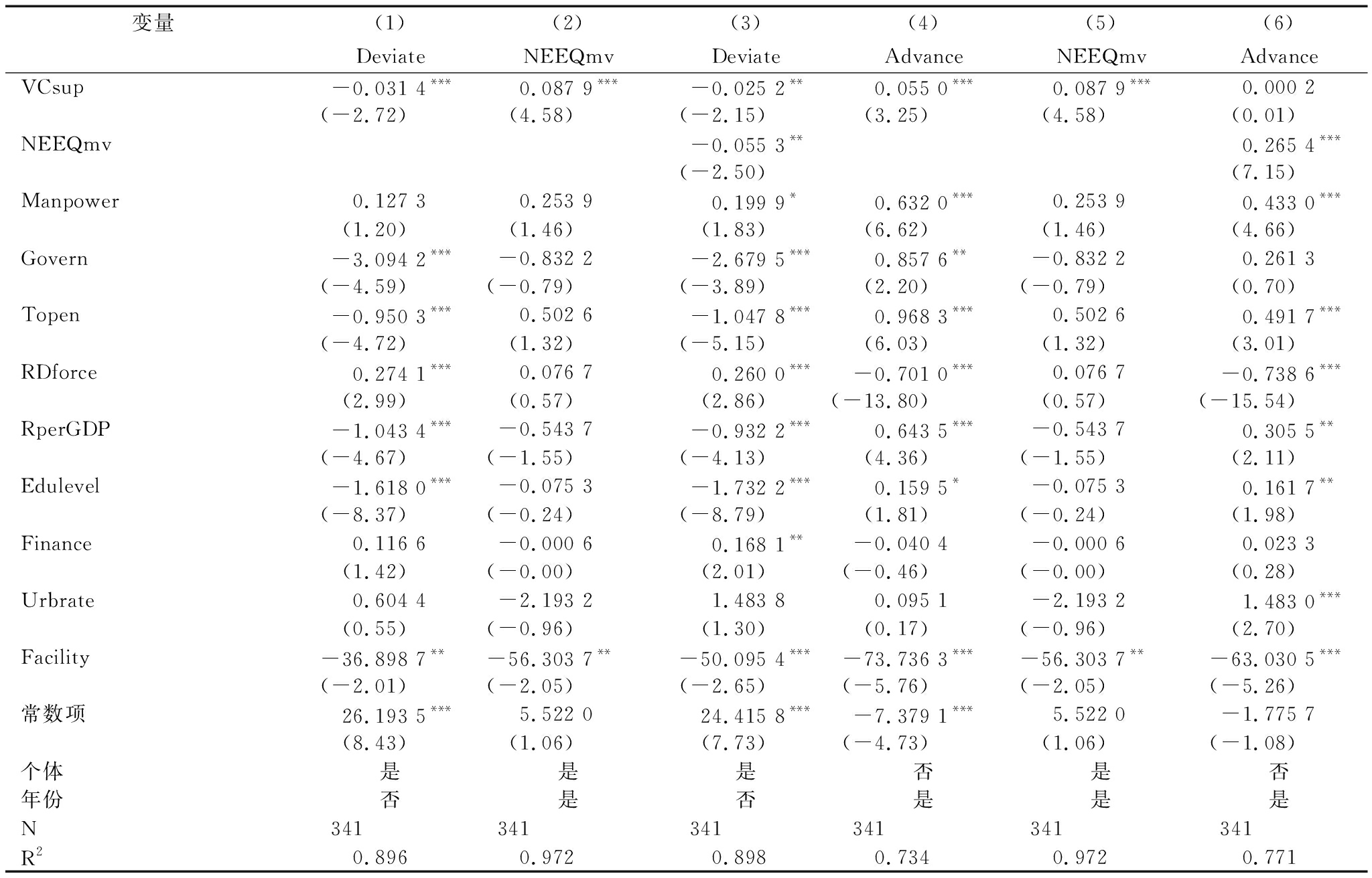 变量(1)(2)(3)(4)(5)(6)DeviateNEEQcvDeviateAdvanceNEEQcvAdvanceVCsup-0.030 7**0.113 7***-0.030 3**0.055 0***0.113 7***0.029 0*(-2.31)(2.81)(-2.30)(3.25)(2.81)(1.85)NEEQcv0.053 9*0.225 2***(1.84)(8.30)Manpower0.120 51.492 6***0.105 80.632 0***1.492 6***0.424 5***(1.00)(4.01)(0.88)(6.62)(4.01)(4.71)Govern-3.021 4***3.443 4-2.844 1***0.857 6**3.443 40.045 9(-4.12)(1.46)(-3.86)(2.20)(1.46)(0.12)Topen-0.942 9***-7.332 8***-0.872 3***0.968 3***-7.332 8***0.704 4***(-3.58)(-10.40)(-3.29)(6.03)(-10.40)(4.72)RDforce0.214 3**0.081 90.156 3-0.701 0***0.081 9-0.702 9***(2.29)(0.26)(1.59)(-13.80)(0.26)(-15.23)RperGDP-0.859 8***-0.245 9-0.780 5***0.643 5***-0.245 90.277 9**(-3.54)(-0.31)(-3.18)(4.36)(-0.31)(1.97)Edulevel-1.982 8***-3.153 1***-1.906 3***0.159 5*-3.153 1***0.181 1**(-9.00)(-4.66)(-8.53)(1.81)(-4.66)(2.27)Finance0.081 30.392 90.072 8-0.040 40.392 90.018 9(0.86)(1.37)(0.77)(-0.46)(1.37)(0.24)Urbrate1.060 343.254 9***1.067 20.095 143.254 9***1.090 3**(0.67)(11.27)(0.68)(0.17)(11.27)(2.11)Facility-44.292 9**-4.1e+02***-30.368 4-73.736 3***-4.1e+02***-48.903 6***(-2.33)(-6.43)(-1.49)(-5.76)(-6.43)(-4.07)常数项29.507 1***-14.880 128.711 1***-7.379 1***-14.880 1-1.698 5(8.21)(-1.37)(7.97)(-4.73)(-1.37)(-1.08)个体是是是否是否年份是否是是否是N341341341341341341R20.9010.8890.9030.7340.8890.781