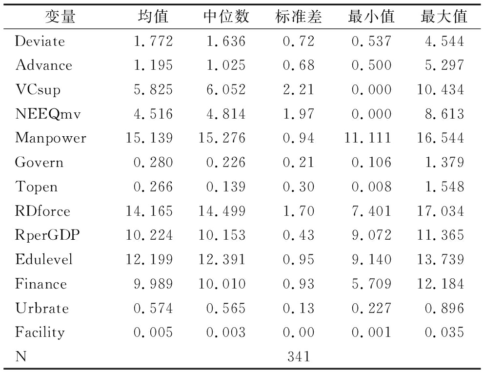 变量均值中位数标准差最小值最大值Deviate1.7721.6360.720.5374.544Advance1.1951.0250.680.5005.297VCsup5.8256.0522.210.00010.434NEEQmv4.5164.8141.970.0008.613Manpower15.13915.2760.9411.11116.544Govern0.2800.2260.210.1061.379Topen0.2660.1390.300.0081.548RDforce14.16514.4991.707.40117.034RperGDP10.22410.1530.439.07211.365Edulevel12.19912.3910.959.14013.739Finance9.98910.0100.935.70912.184Urbrate0.5740.5650.130.2270.896Facility0.0050.0030.000.0010.035N341
