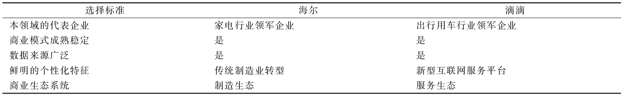 选择标准海尔滴滴本领域的代表企业家电行业领军企业出行用车行业领军企业商业模式成熟稳定是是数据来源广泛是是鲜明的个性化特征传统制造业转型新型互联网服务平台商业生态系统制造生态服务生态