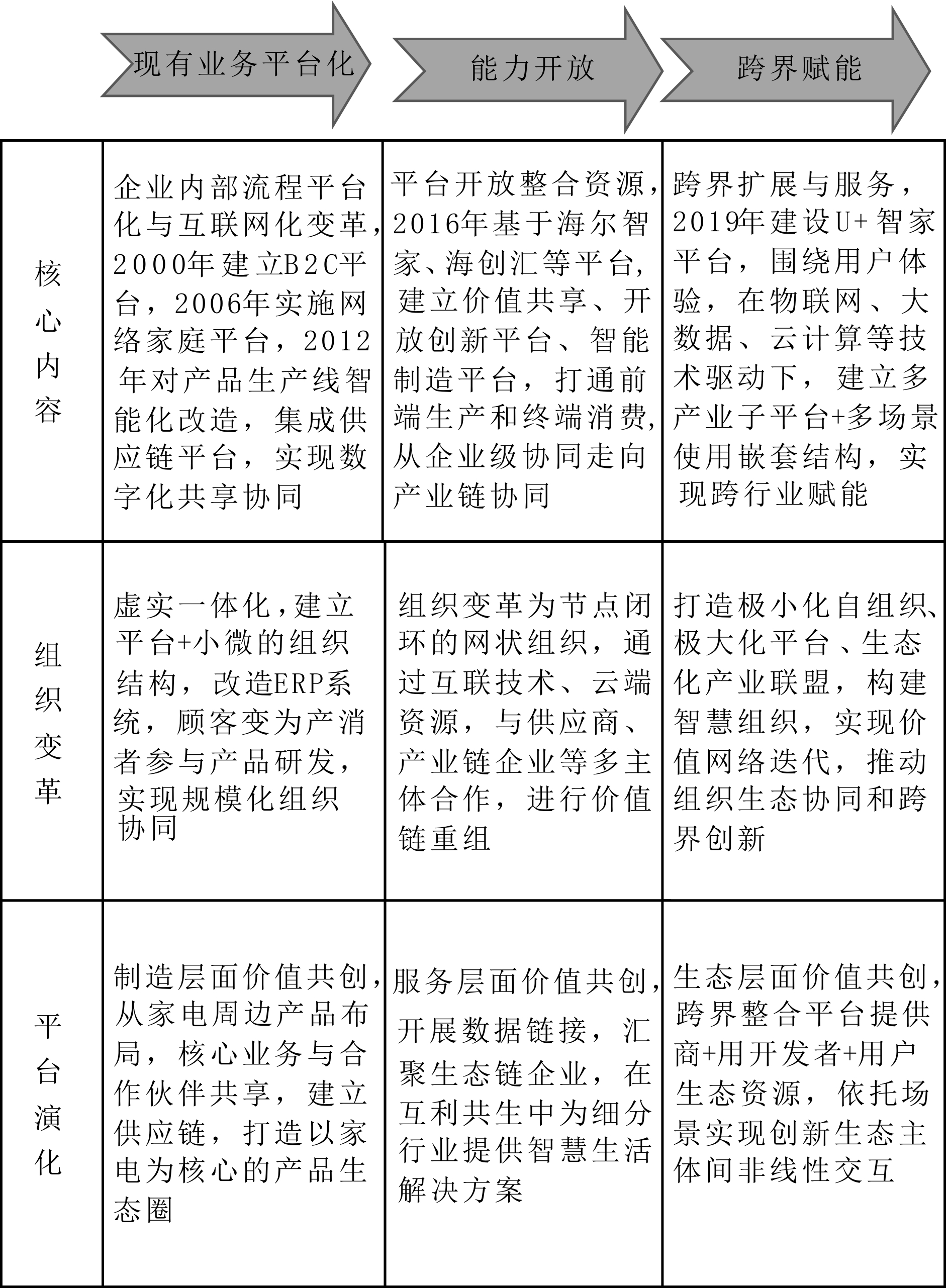 (2)变革组织,企业需要根据战略目标,搭建资源共享的平台化组织架构,整合全球创新要素,为内外部主体赋能,以此促进平台化战略实施。