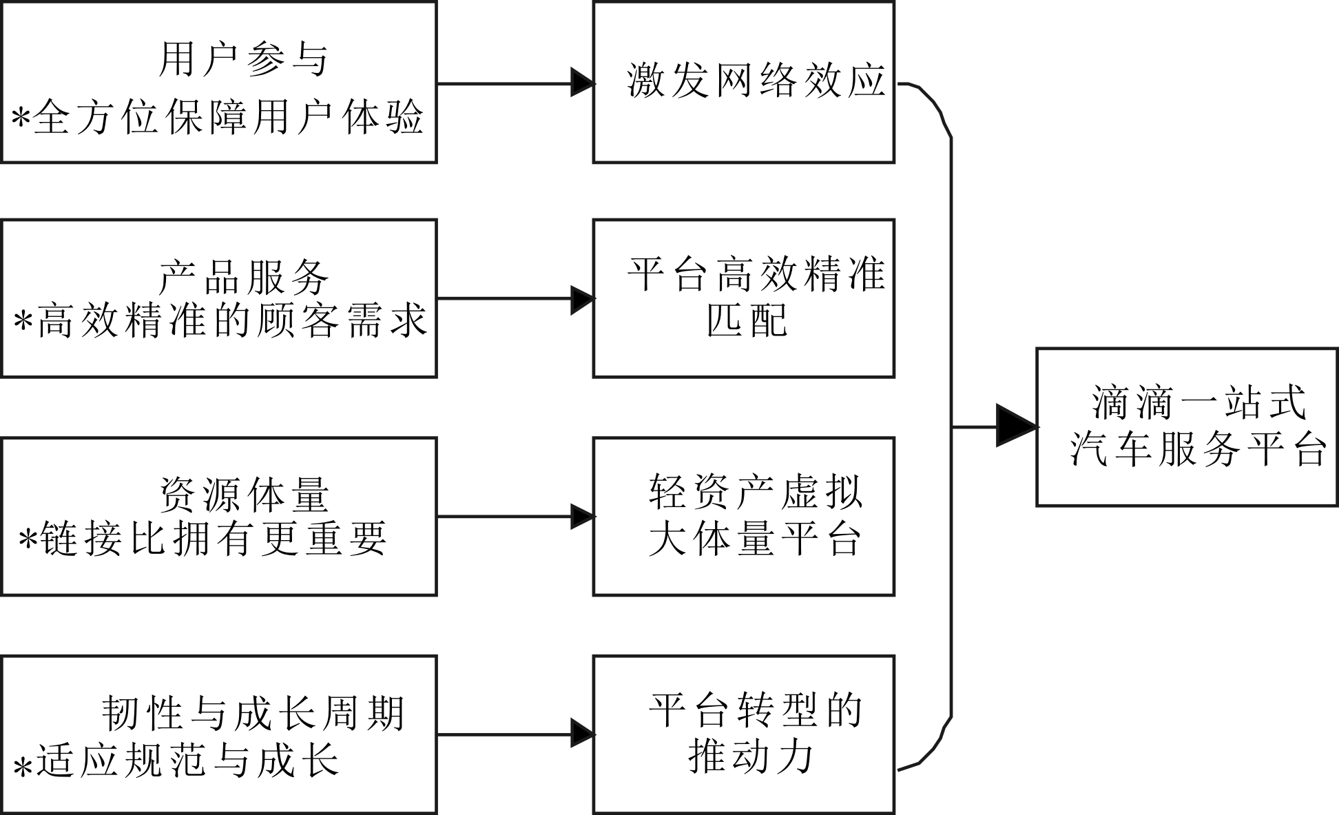 创新型企业可以尝试利用平台积累资源,逐渐成长为大型企业。作为初创企业,小桔科技在创业初期既没有实体车辆资源,也没有出租车和司机,短短几年却颠覆全国用车出行行业,凭借的不是大体量资源,而是连接关系。借助平台,滴滴整合闲置车辆、司机资源,聚集优势资源,发挥网络效应,由此形成较大的虚拟规模。滴滴连接的司机超过两千万,微信每月活动用户高达几十亿,足以证明在平台化时代,互联网企业可以成为大规模企业。运营方面,滴滴积极开展全球化布局,与美国Lyft、印度ola等公司达成战略合作。滴滴的愿景是成为技术驱动型公司,为用户提供一站式出行解决方案,成为智能交通技术领域的领导者。滴滴凭借较强的融资能力,加大前沿技术投资,在美国硅谷成立研究院,吸纳顶尖科技人才,在智能驾驶和智慧交通技术方面取得突破。凭借科学的公司战略,滴滴采取战略合作、合并、融资并购等方式获得最优秀的经营管理和技术团队资源,真正转变为大体量平台。