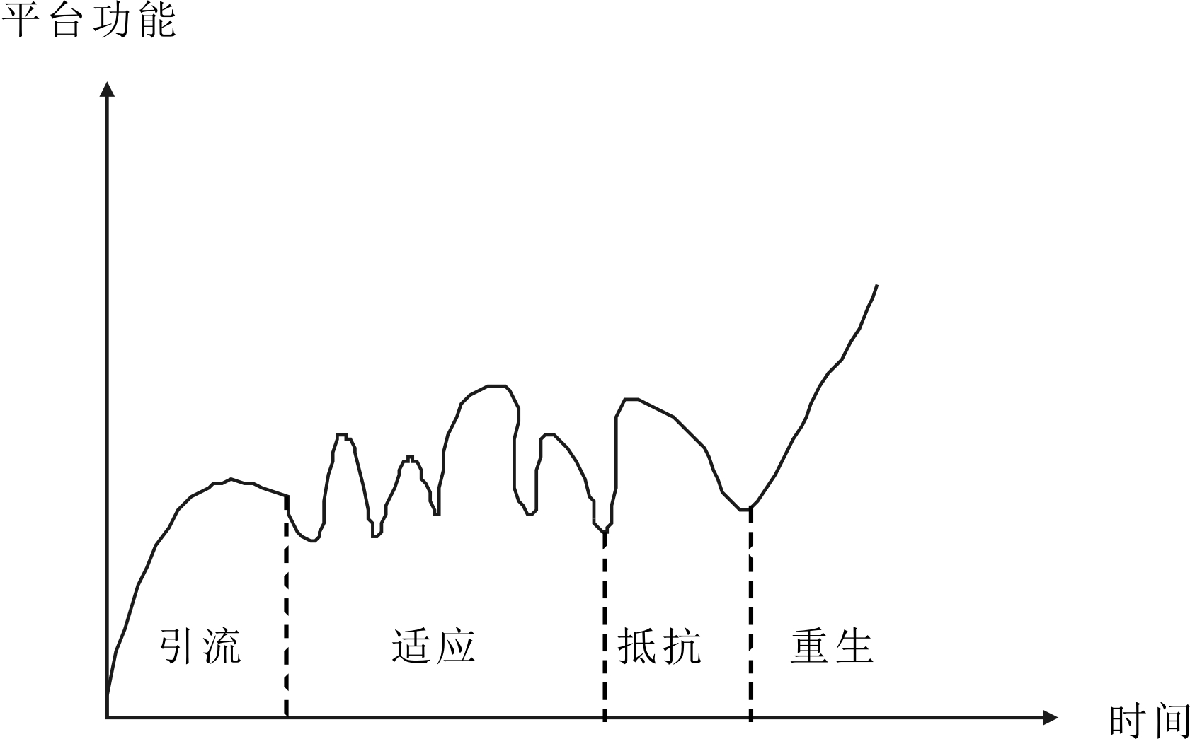 企业制定平台战略的目的是为了提升自身环境韧性和反应速度[22]。韧性是企业抵抗外界冲击、恢复和适应成长的重要属性,根据“过程—能力”学说,平台韧性提升需要经历漫长的周期,平台在不同成长阶段(如引流、适应、抵抗和重生)会展现出不同的能力,如图10所示。