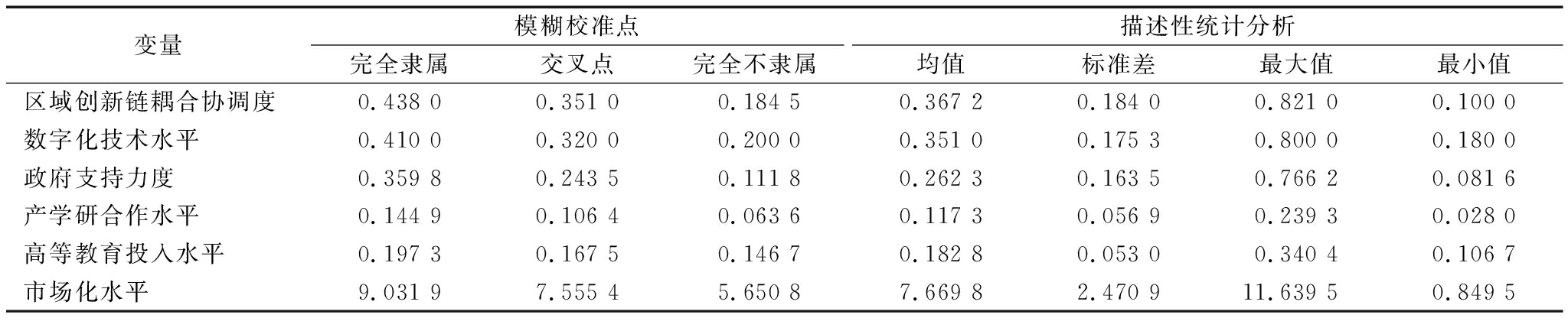 受数据样本量限制,参考现有学者研究[28,31],分别选取样本数据的上四分位数(75%)、中位数(50%)、下四分位数(25%)作为“完全隶属”、“交叉点”、“完全不隶属”锚点,研究变量校准及描述性统计分析结果如表2所示。
