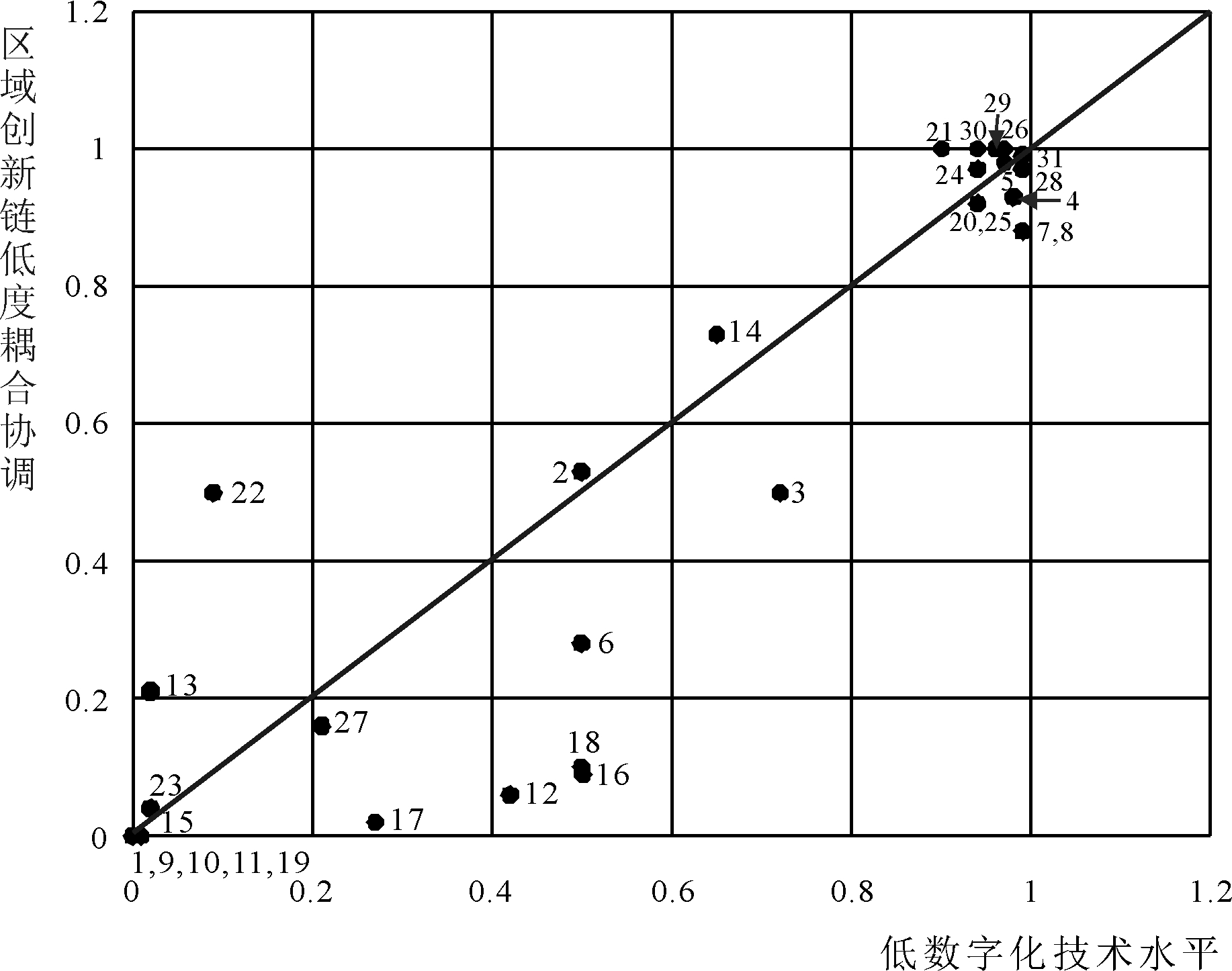 Fig.2 X-Y scatter plot of low digital technology level and low coupling coordination of innovation chain