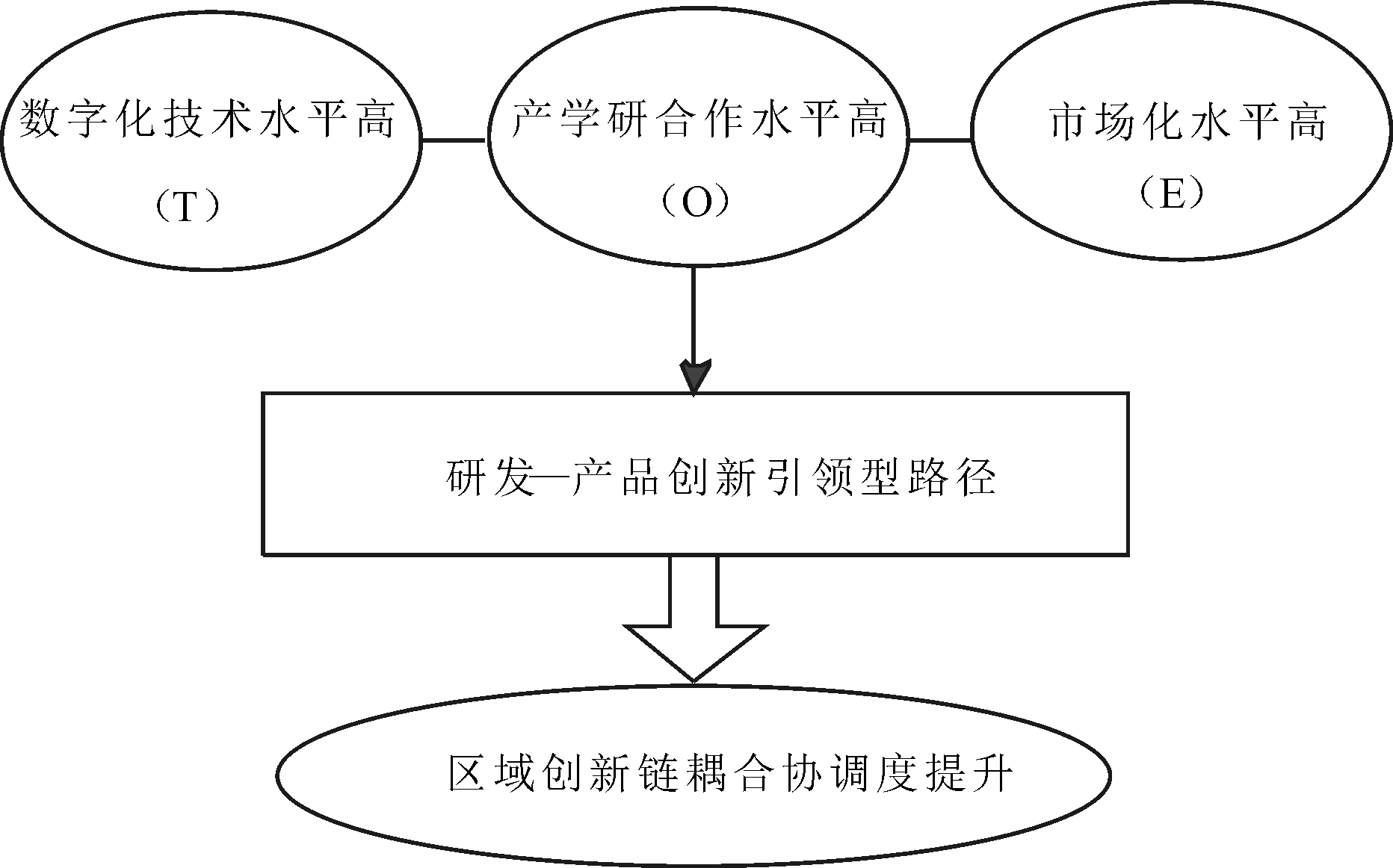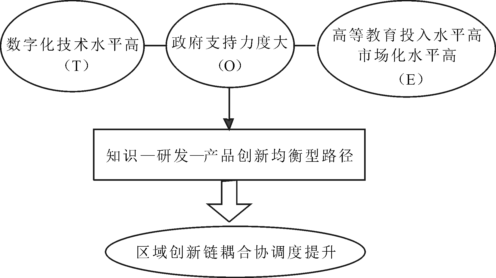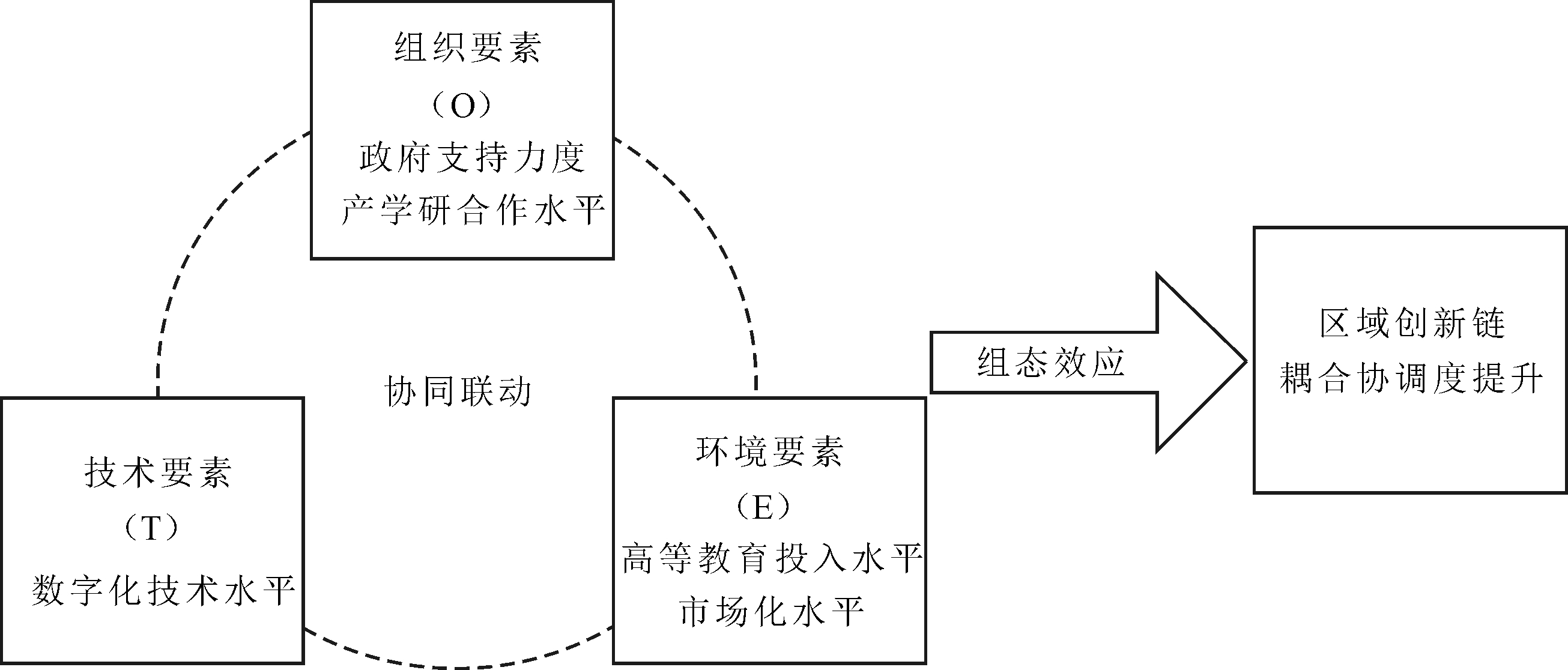 TOE理论在解释复杂社会现象成因以及提取影响要素方面具有良好效果[19]。根据该理论,区域创新链耦合协调度会受到区域技术条件、组织特性及宏观环境3个维度的影响[20],因而可作为探讨多要素驱动区域创新链耦合协调度提升前因条件的理论分析框架。本文从整体性考虑,采用归纳法识别出技术(T)、组织(O)和环境(E)3个维度下的5个影响要素,以要素之间的协同联动形成多元组态,进而构建多要素驱动区域创新链耦合协调度提升的组态效应模型,具体如图1所示。