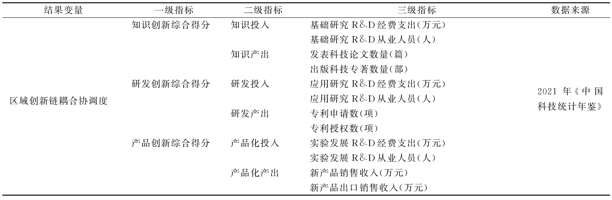 结果变量一级指标二级指标三级指标数据来源区域创新链耦合协调度知识创新综合得分知识投入基础研究R&D经费支出(万元)基础研究R&D从业人员(人)知识产出发表科技论文数量(篇)出版科技专著数量(部)研发创新综合得分研发投入应用研究R&D经费支出(万元)应用研究R&D从业人员(人)2021年《中国科技统计年鉴》研发产出专利申请数(项)专利授权数(项)产品创新综合得分产品化投入实验发展R&D经费支出(万元)实验发展R&D从业人员(人)产品化产出新产品销售收入(万元)新产品出口销售收入(万元)